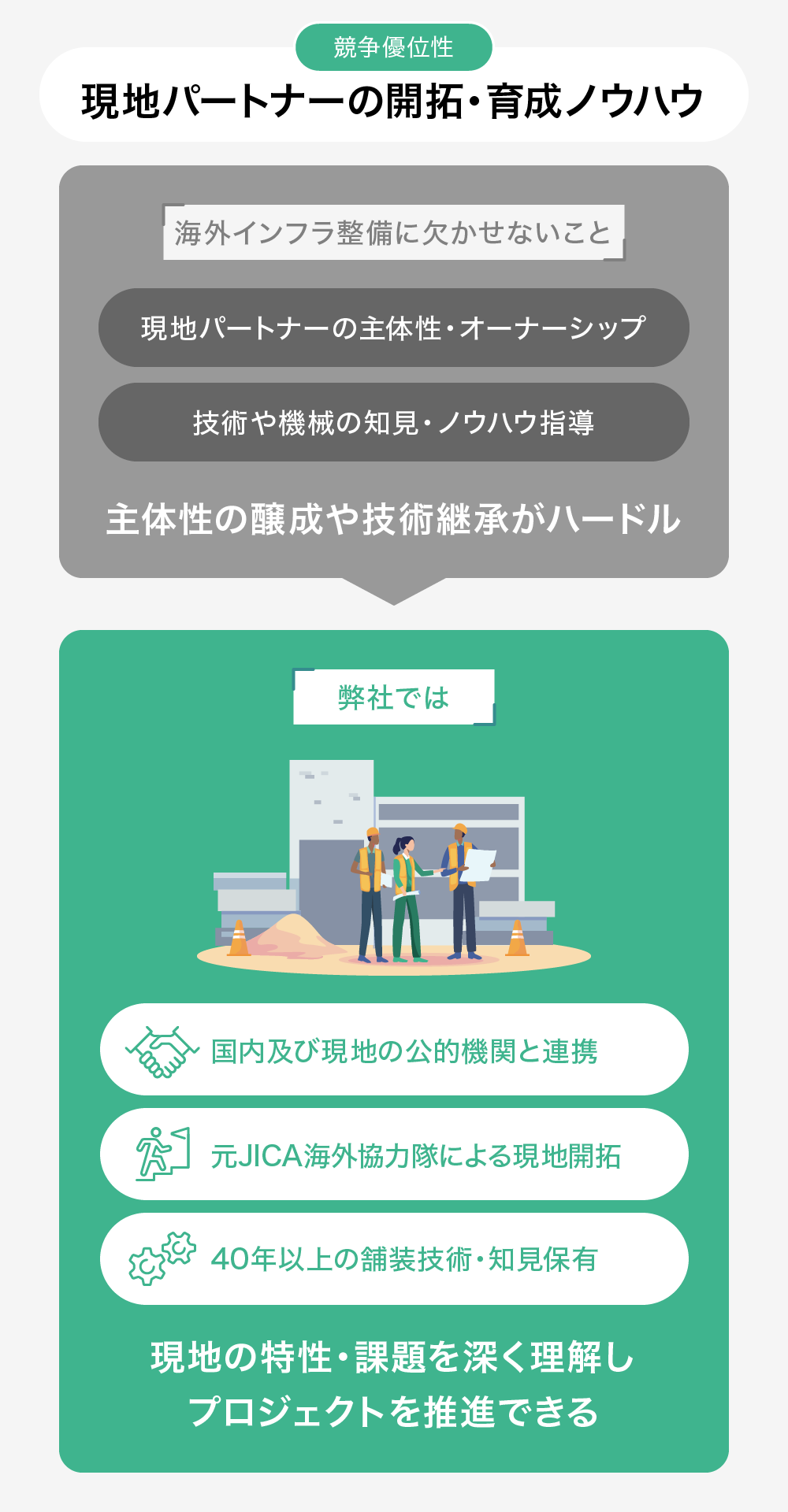 この中では、環境への配慮や経済性など6つの原則で構成されていますが、弊社は「STEIN」を通じてそれぞれに価値の提供をしていきたいと考えています。環境に配慮した強じん性や長期メンテナンスが不要なライフサイクルコストなど、すでに提供できていると自負するものもありますが、今後は現地パートナーの育成や雇用創出も強化していきたいと考えています。このように、「質の高いインフラ」を示していくことで、国内外の公的機関や民間との連携もより一層強化されていくと考えています。