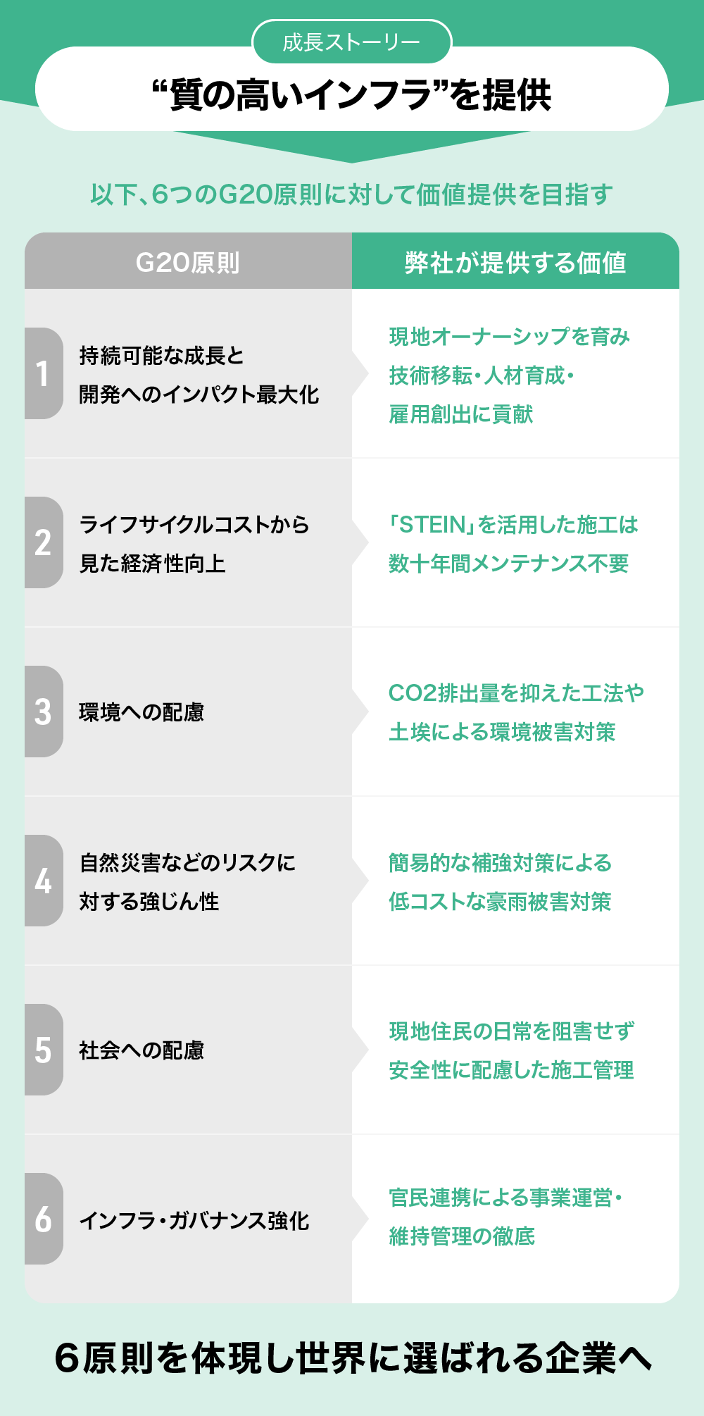 弊社は今後、アフリカ全土、東南アジアへの展開を加速し、グローバルサウスの発展に貢献していきたいと考えています。そのためにも弊社が指針としているのが、G20各国首脳間で合意された「質の高いインフラ投資に関するG20原則」です。