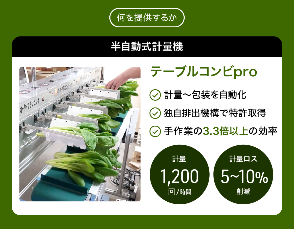 誰でも熟練者以上の早さで農作物の計量ができる「テーブルコンビ」、傷みやすい葉物野菜も自動でベルトコンベアに乗せられるフレキシブル排出機構(日本、進出中の台湾で特許取得済み)を備えた「テーブルコンビpro」などをラインナップしており、農家のほか、飲食品や調味料、包装資材などの大手メーカーなどへ累計330台を導入しています(2023年7月時点)。