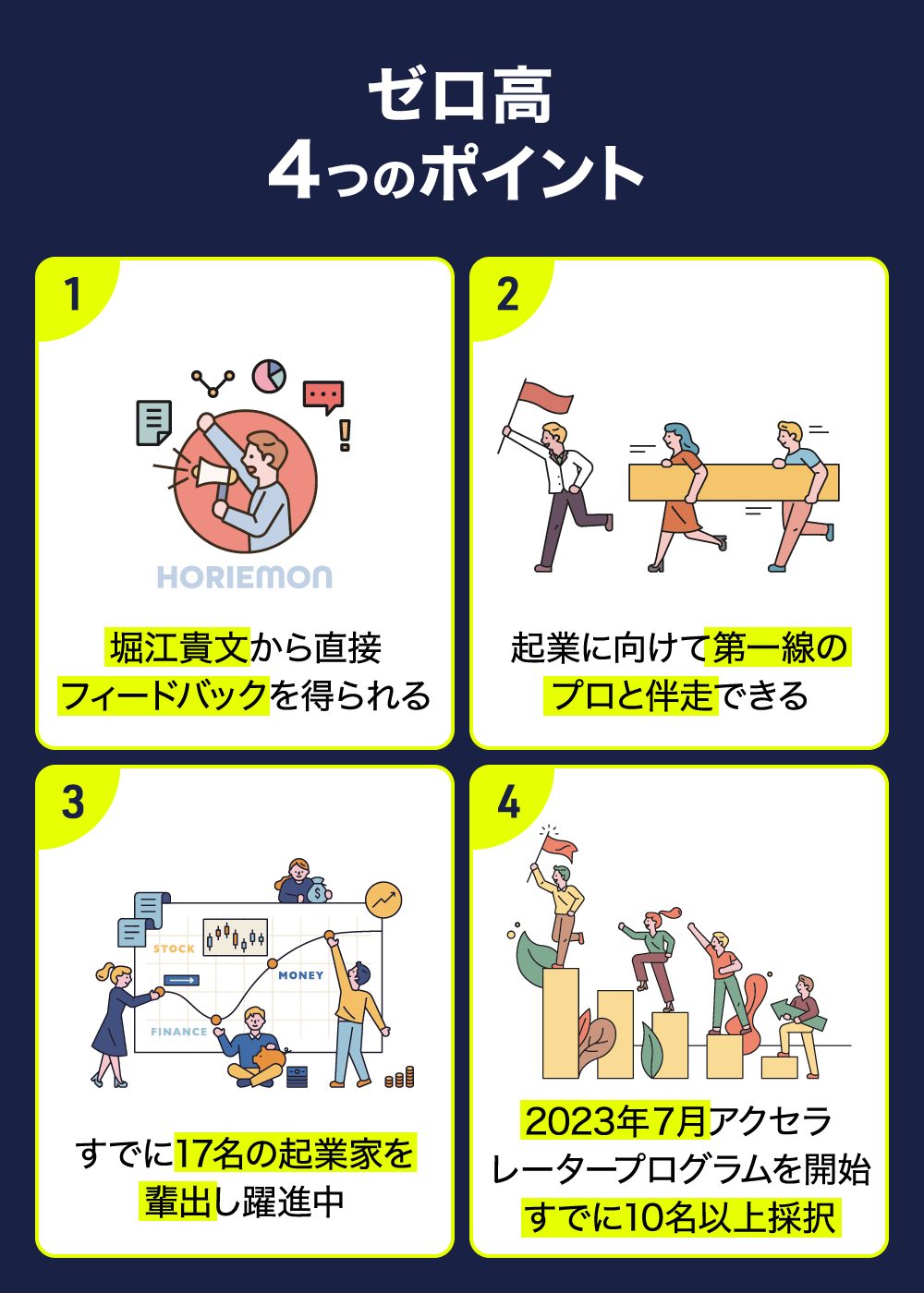 「ゼロ高」の運営とアクセラレータープログラム、この2軸でマネタイズを強化し、さらなる成長を図ります。「若手こそ日本を変える」空気感を醸成することを目指します。