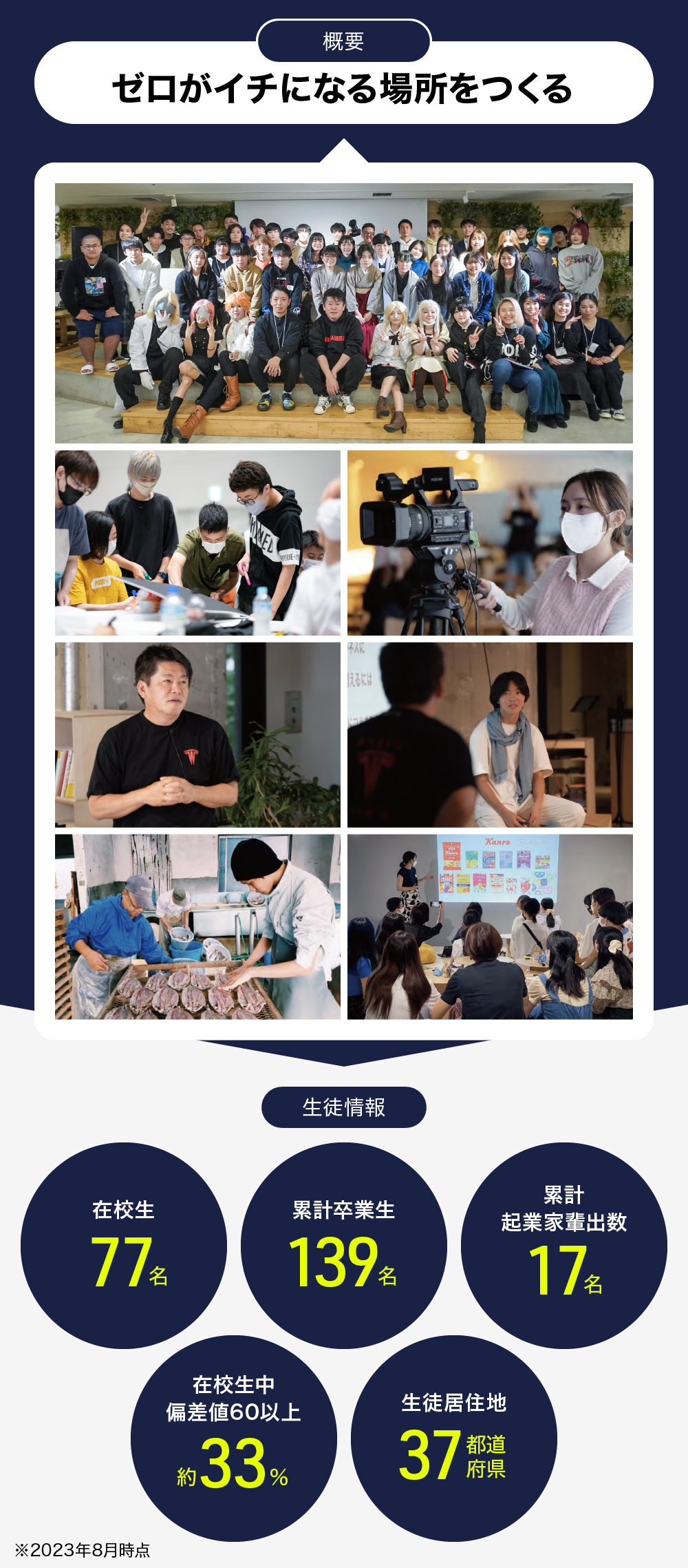 ホリエモンこと実業家の堀江貴文が主宰を務め、これまで手掛けた事業における実体験を基にして、生徒の「やりたい」「やってみたい」を実現するための実践的な学びをオンラインとオフラインで提供しています。