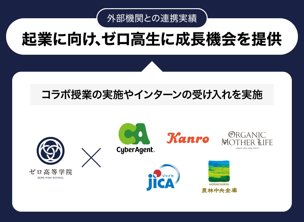 また、ゼロ高では大手企業や公的機関と連携したインターンシップやコラボ授業も実施しており、生徒はじめ保護者の関心を引いています。例えば、株式会社サイバーエージェントでは、生徒が制作した広告に対するフィードバックを受けたり、独立行政法人国際協力機構(JICA)では、「食」をテーマとしたフィールドワークを通じてSDGsについて学べるなどの貴重な機会を提供しています。