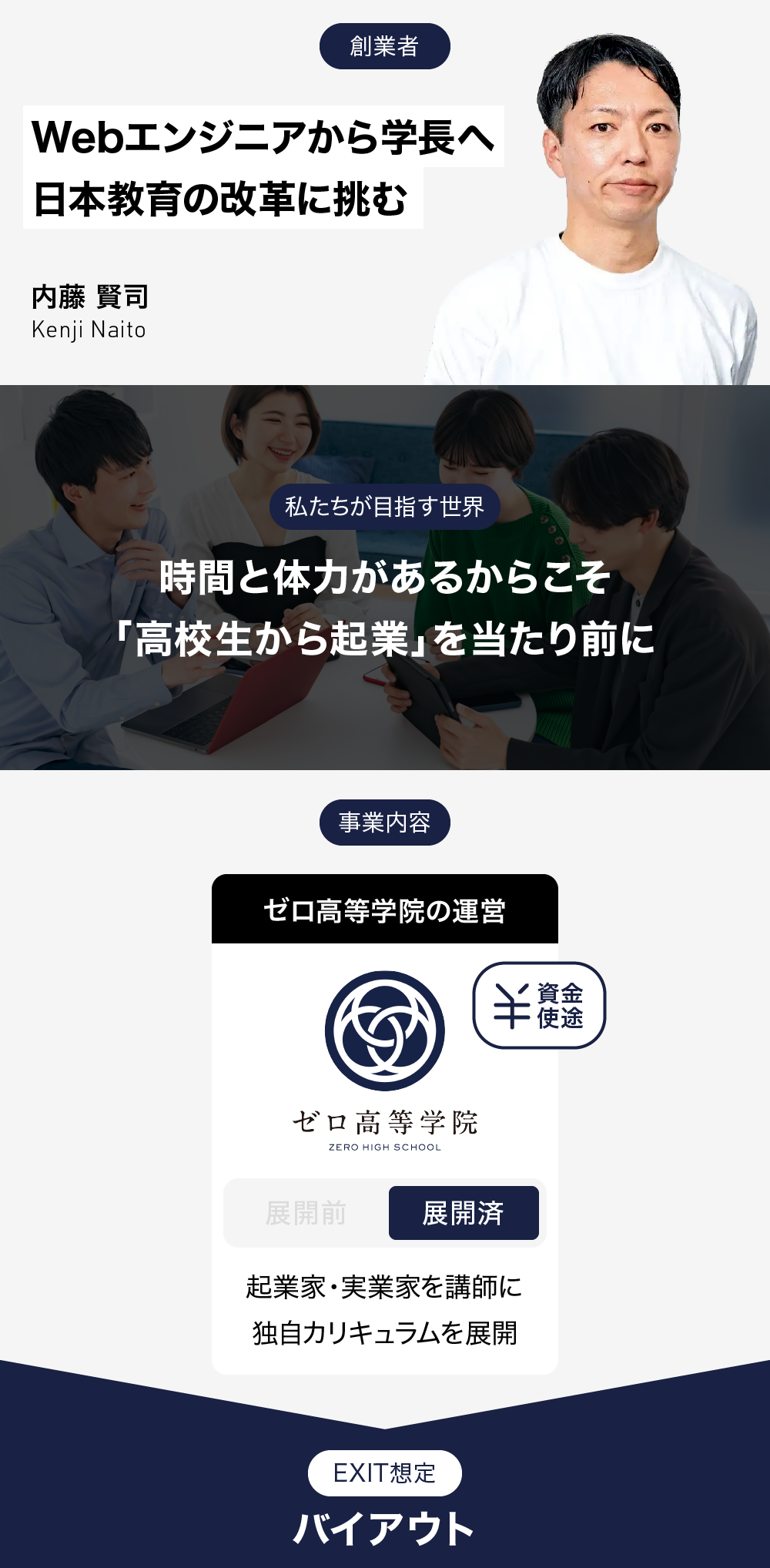 弊社代表の内藤は、エンジニアとして長年Web業界に従事した後、教育系ベンチャー企業に参画しました。そこで当時の社長から「ゼロ高等学院(以下、ゼロ高)」事業の構想を聞き、自ら手を挙げて学院長となりました。