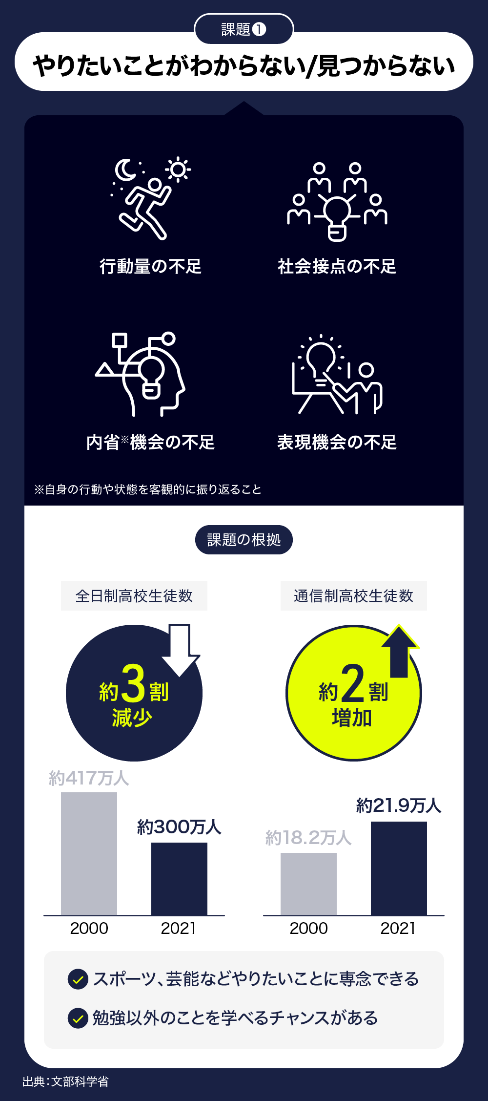 自分の考えを発表したり、自ら問題提起をする機会が少なく、どうしても社会接点や行動の量、表現機会が不足してしまいます。自分の夢ややりたいことを実現するために必要な、実行する力やプレゼンテーション能力が育ちにくいと考えています。