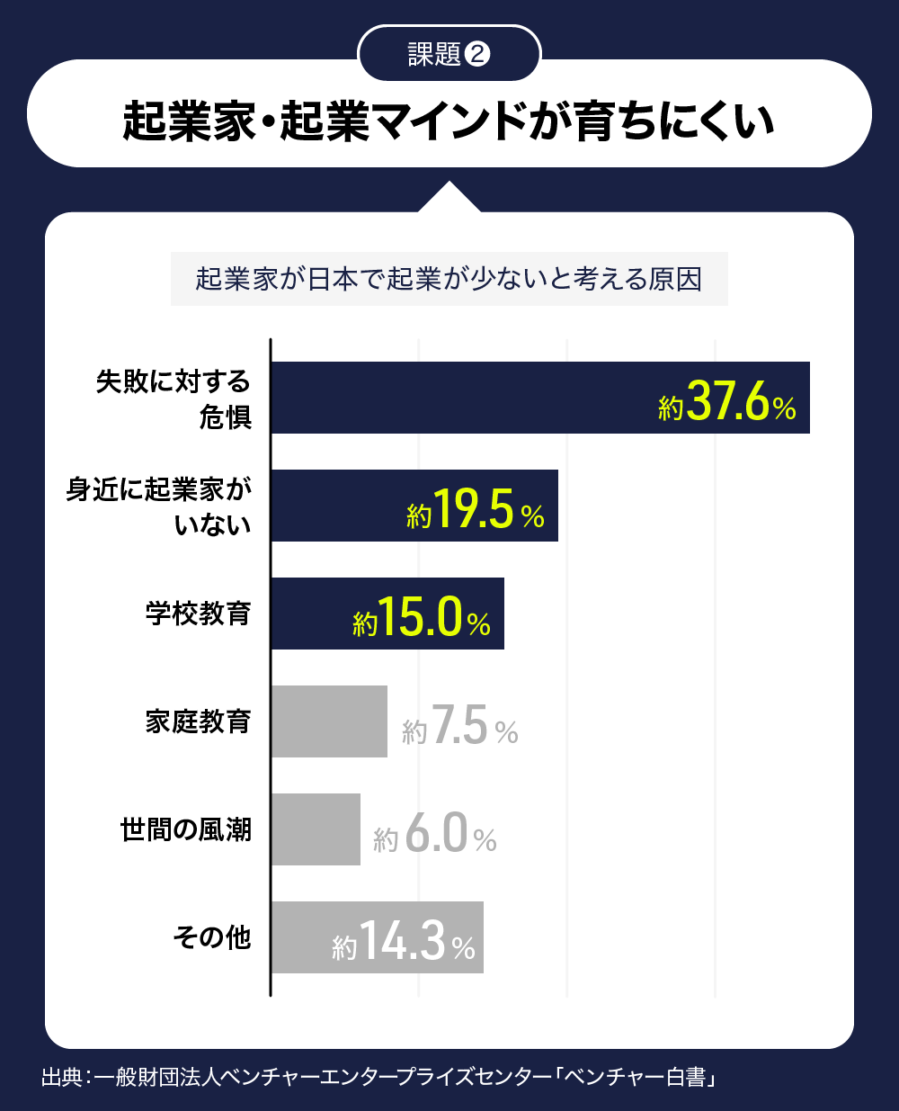 日本で起業が少ない主な原因として、失敗に対する危惧・身近に起業家がいないこと・学校教育の3つが指摘されている