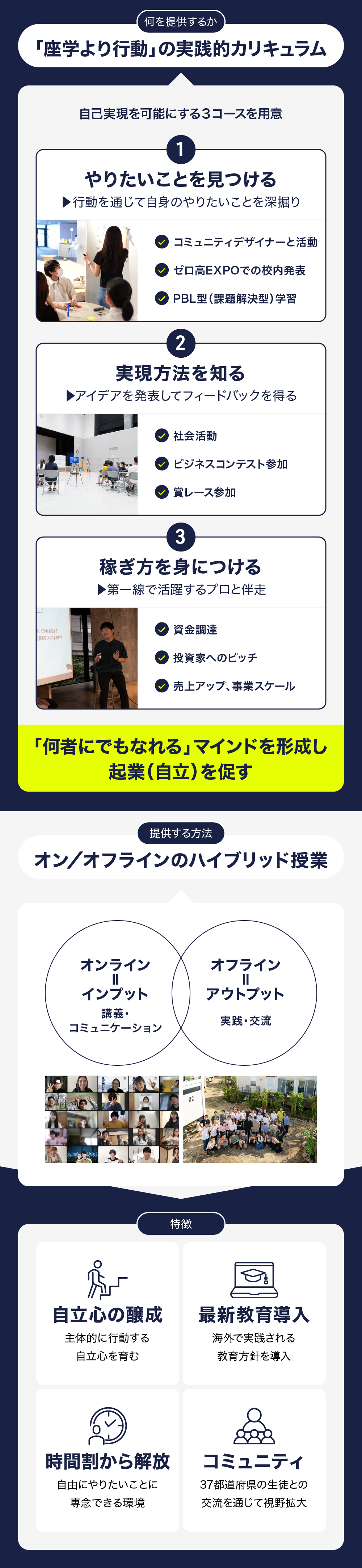 起業という軸を中心に「自分は何者で」「何に興味を持ち」「どのように生きるのか」に没頭できる環境をつくり、自分で意思決定ができ、生きること、働くこと(働かされることではない)が楽しめる若者を輩出したいと考えています。