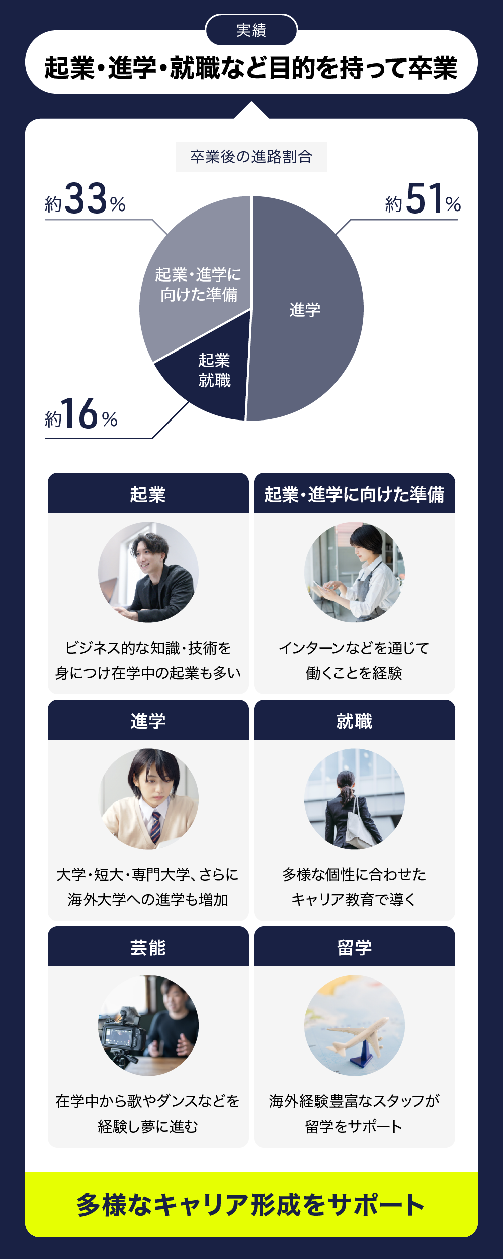 卒業生の進路は、大学進学が半数程度、起業・就職が約16%、ギャップイヤー(起業、進学等に向けた準備期間)を取得する生徒が約33%となっており、各々が自分のやりたいことを見つけて進んでいます。