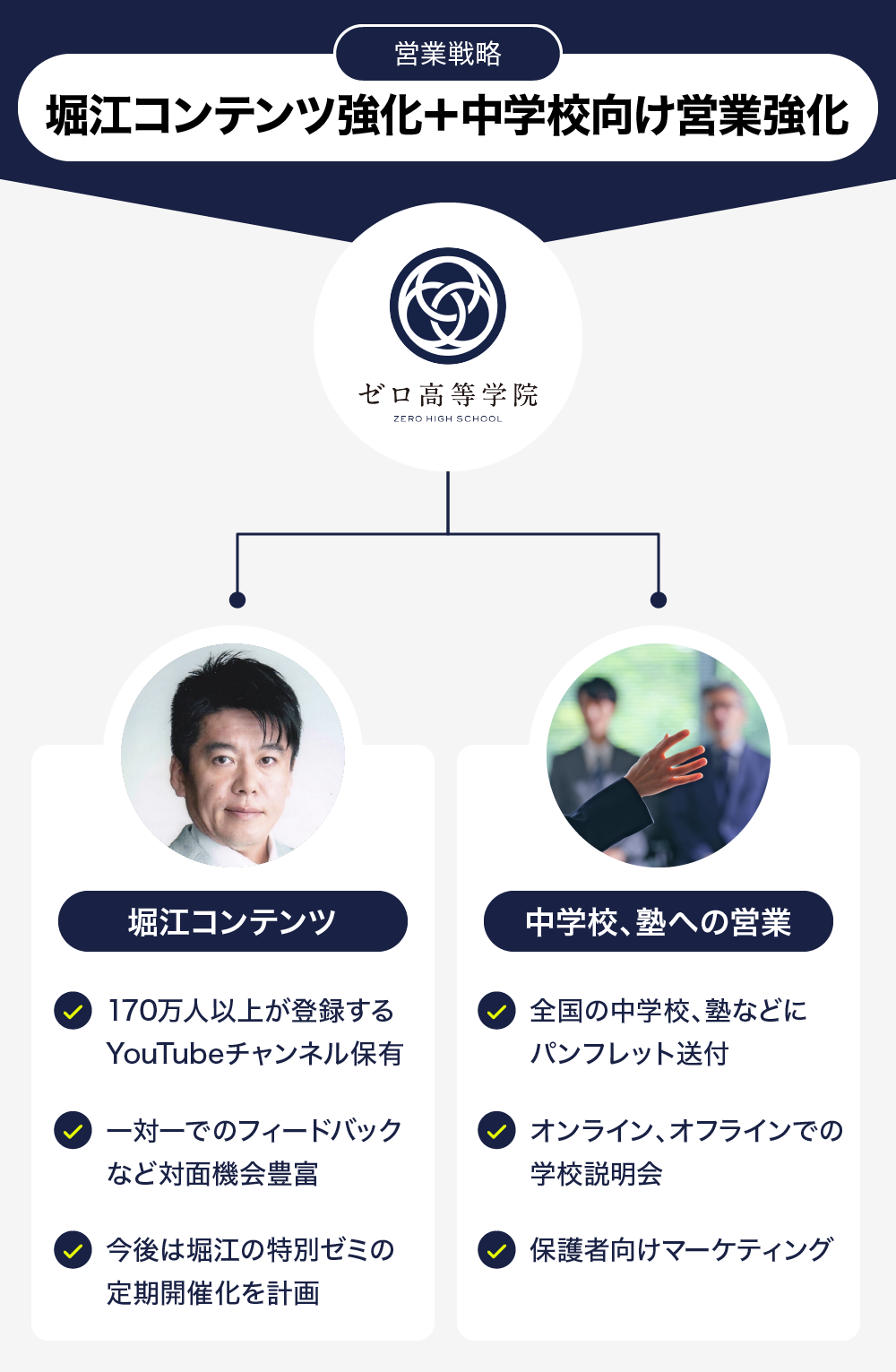 堀江のチャンネル視聴者やSNSのフォロワーのメイン層は、ちょうど生徒達の親世代にあたります。親が堀江の発信から「ゼロ高」を知り、子どもに紹介するというケースも多く、現在の在校生のほとんどが堀江のYouTubeチャンネル経由で入学に至っています。