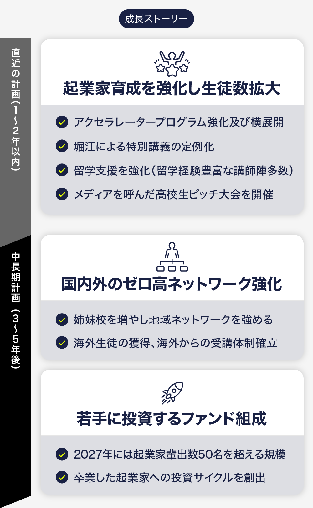 大学生や新社会人への事業展開、日本各地へのサテライト校設置等による地域ネットワーク力の強化、若者専門の投資ファンド組成を目指す