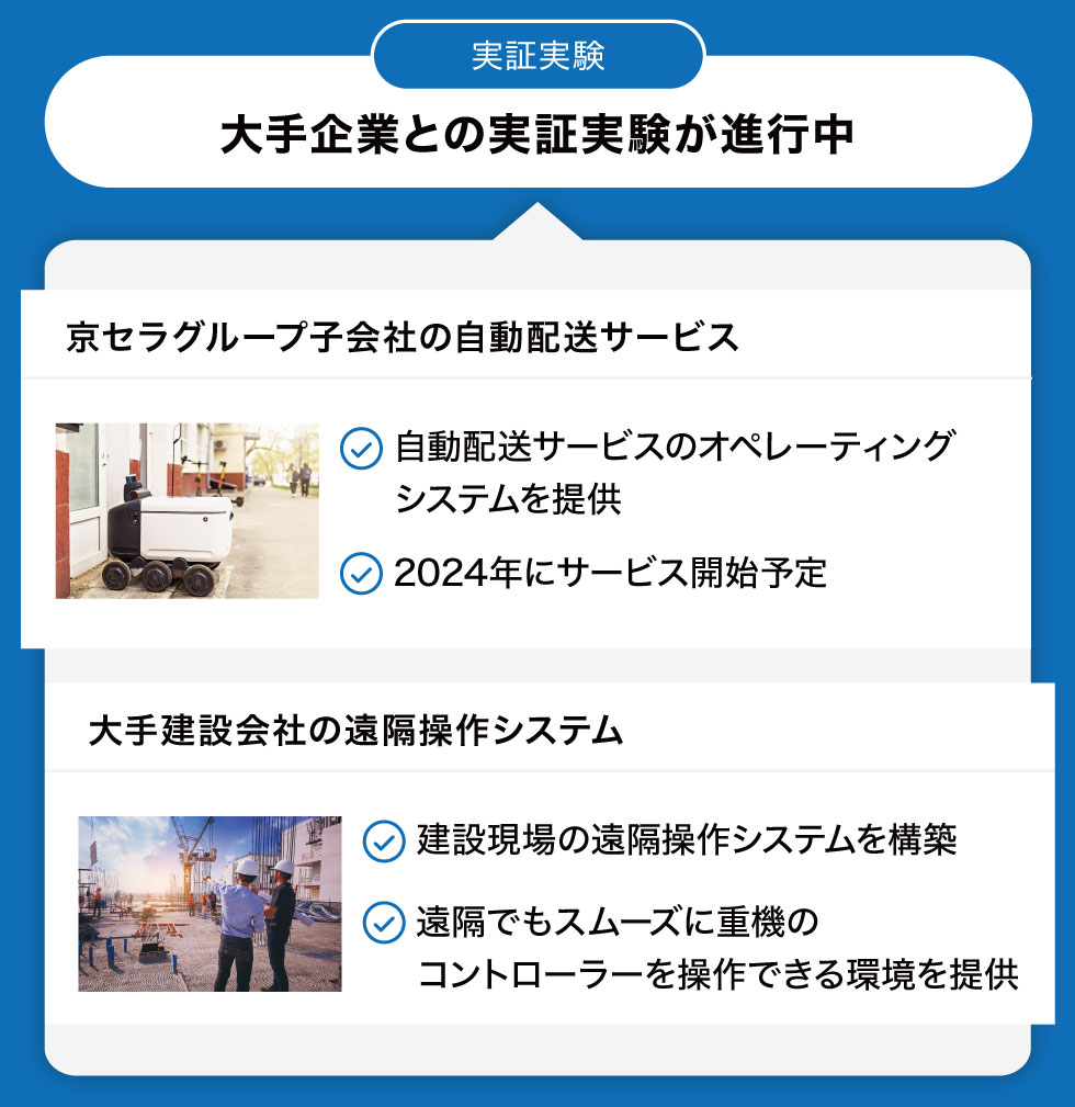 これまでに実証実験として、京セラグループの子会社との遠隔操作ロボットによる自動配達サービスや、大手建設会社の建設現場における遠隔操作システム構築を行った実績があります。