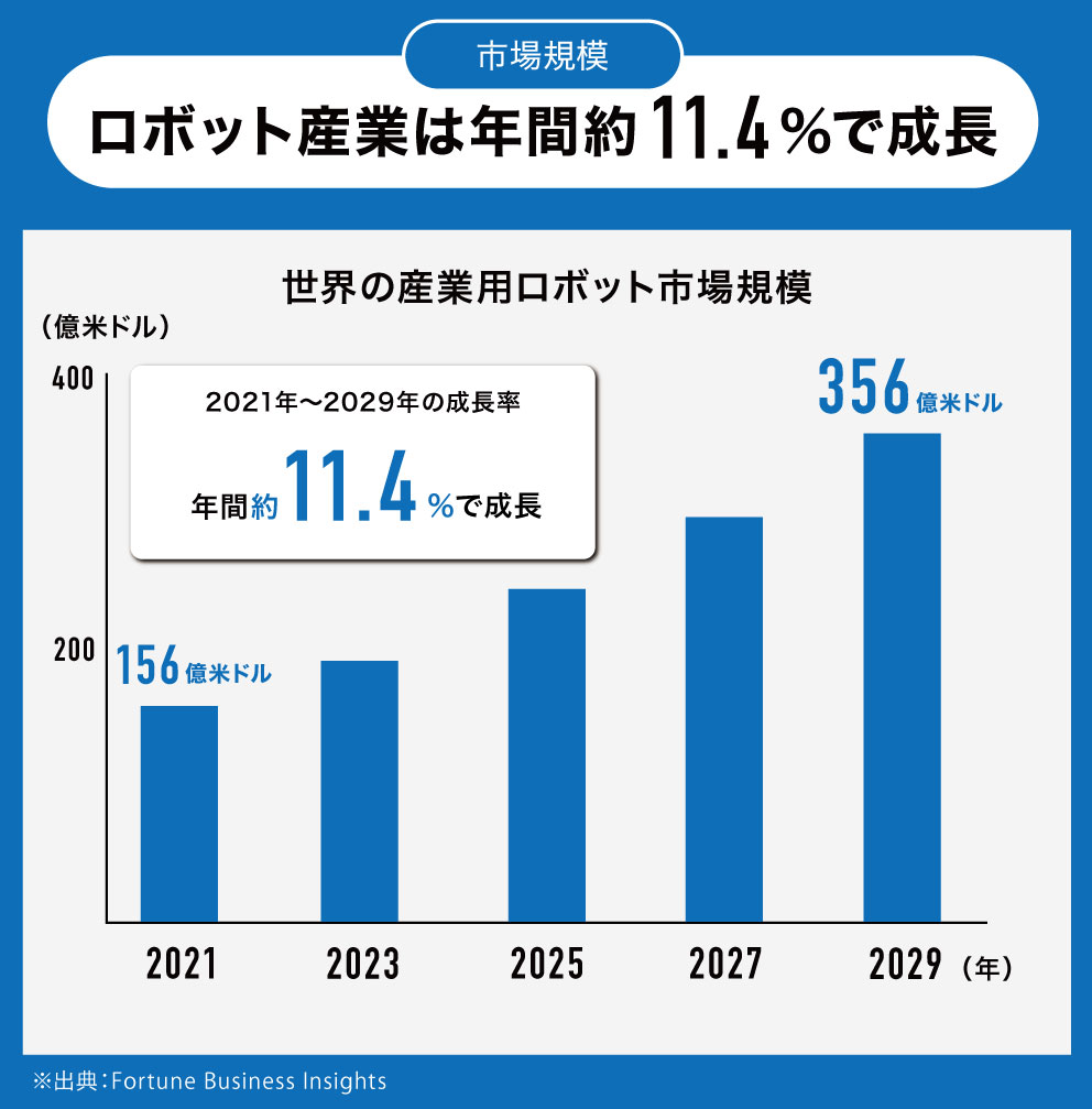 実際、ロボット産業の市場規模は拡大しており、世界の産業用ロボット市場は2021年に約156億米ドル、2029年には約356億米ドルにまで成長し、期間中の年間成長率は約11.4%と予測されています(出典:Fortune Business Insights「産業用ロボットの市場規模、シェア、業界分析」)。