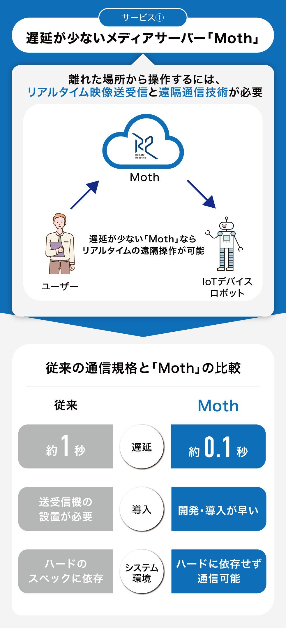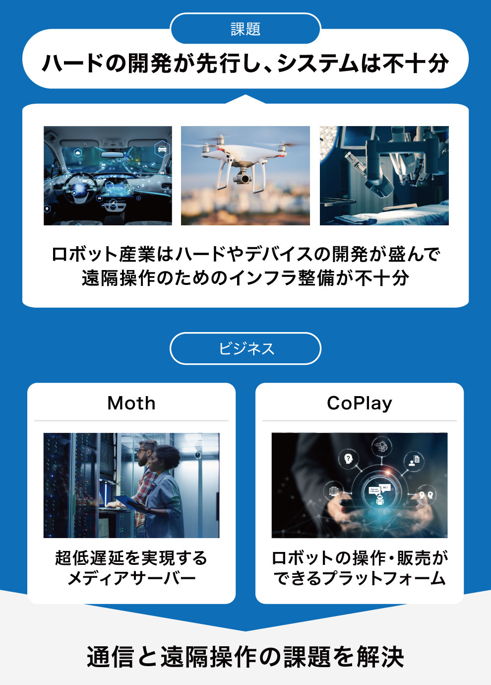 弊社は、親会社が独自開発した超低遅延メディアサーバー「Moth」を使用して、この先の未来に必要とされるロボットの遠隔操作をスムーズに行える世界を創りたいと考えています。