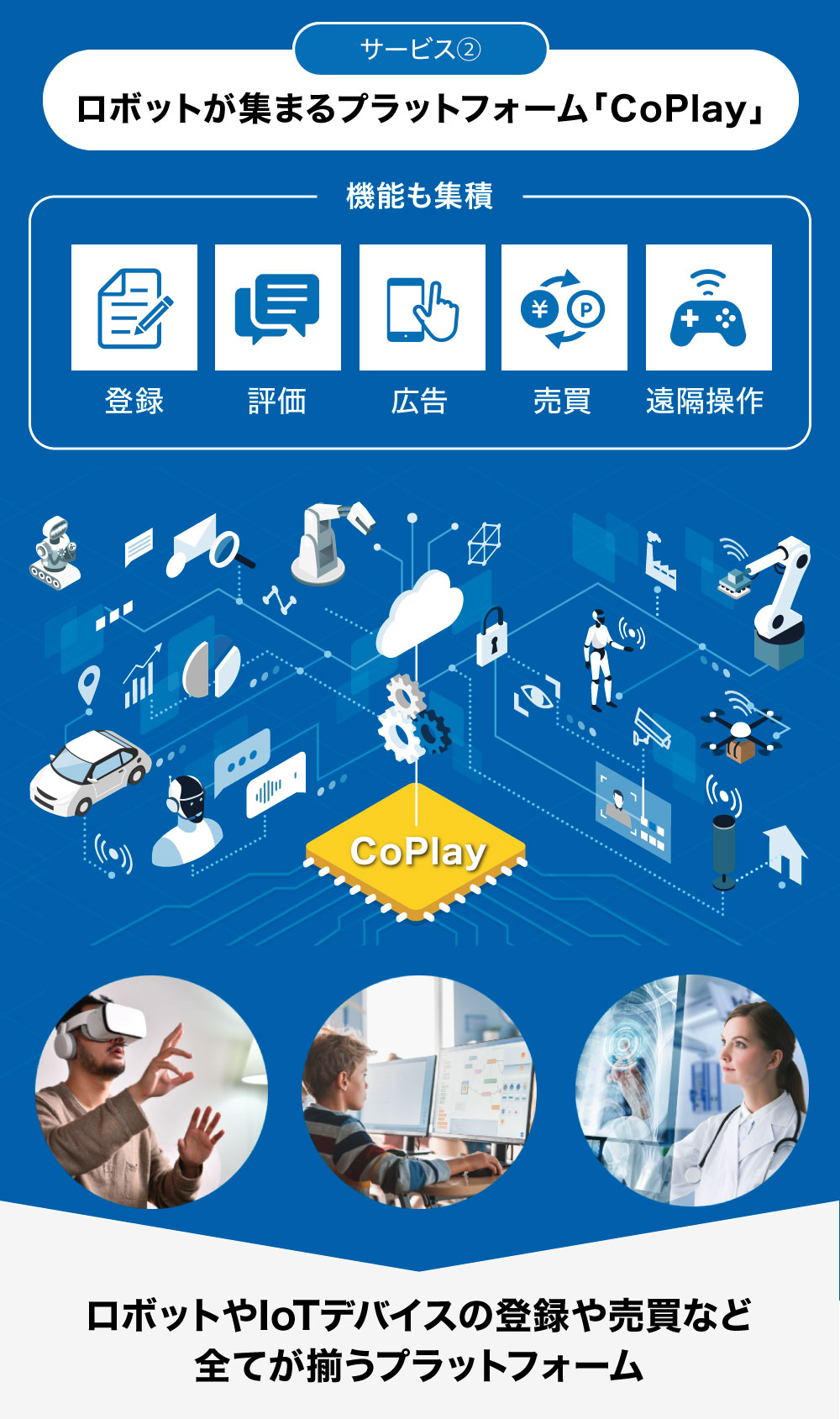 さらに「CoPlay」では遠隔操作だけでなく、ロボットやIoT製品の売買も可能で、ロボットやIoTデバイスに関する全てが揃うプラットフォームを想定しています。