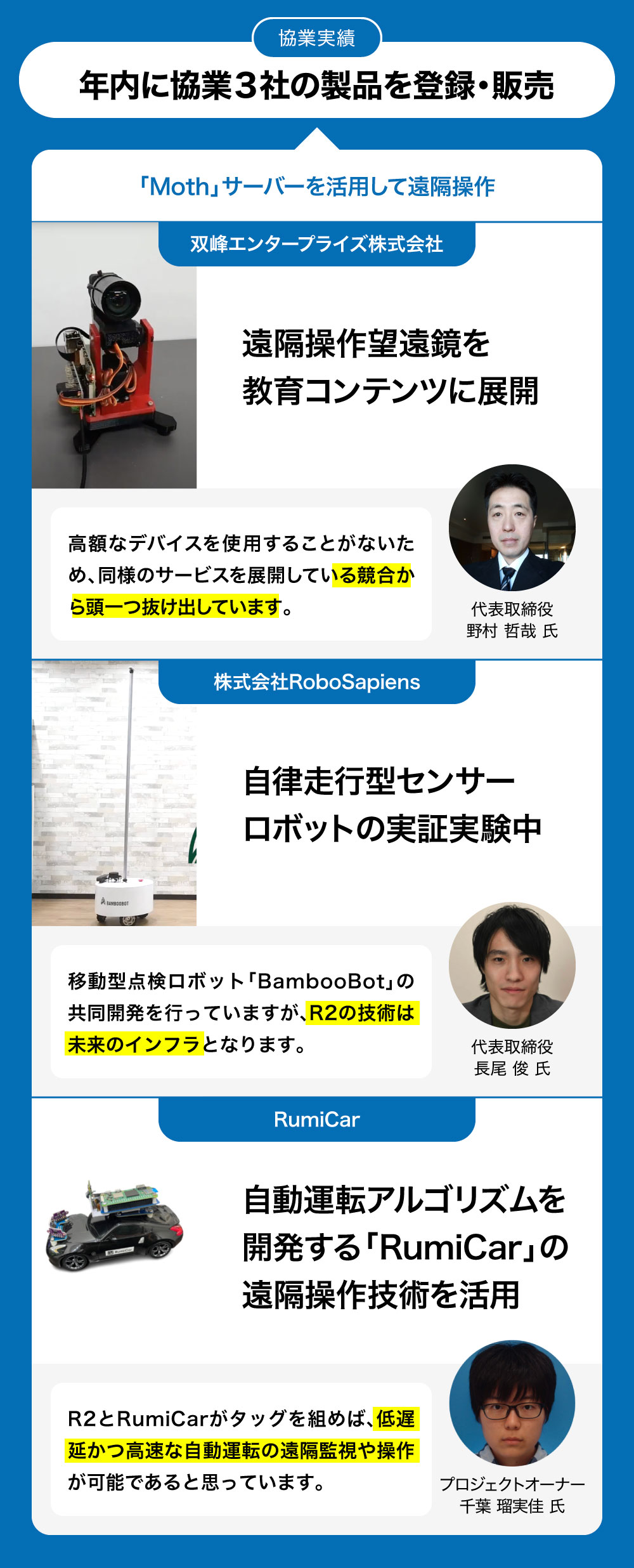 さらに、2023年の下半期には、株式会社RoboSapiensと共同で開発した点検ロボットや、双峰エンタープライズ株式会社と共同開発した遠隔操作望遠鏡、RumiCarと共同開発した遠隔操作「ルミカー」の販売を開始する予定です。今後は、工場の点検システム構築やロボット製造事業者とも連携しながら、商品数の拡大を目指しています。
