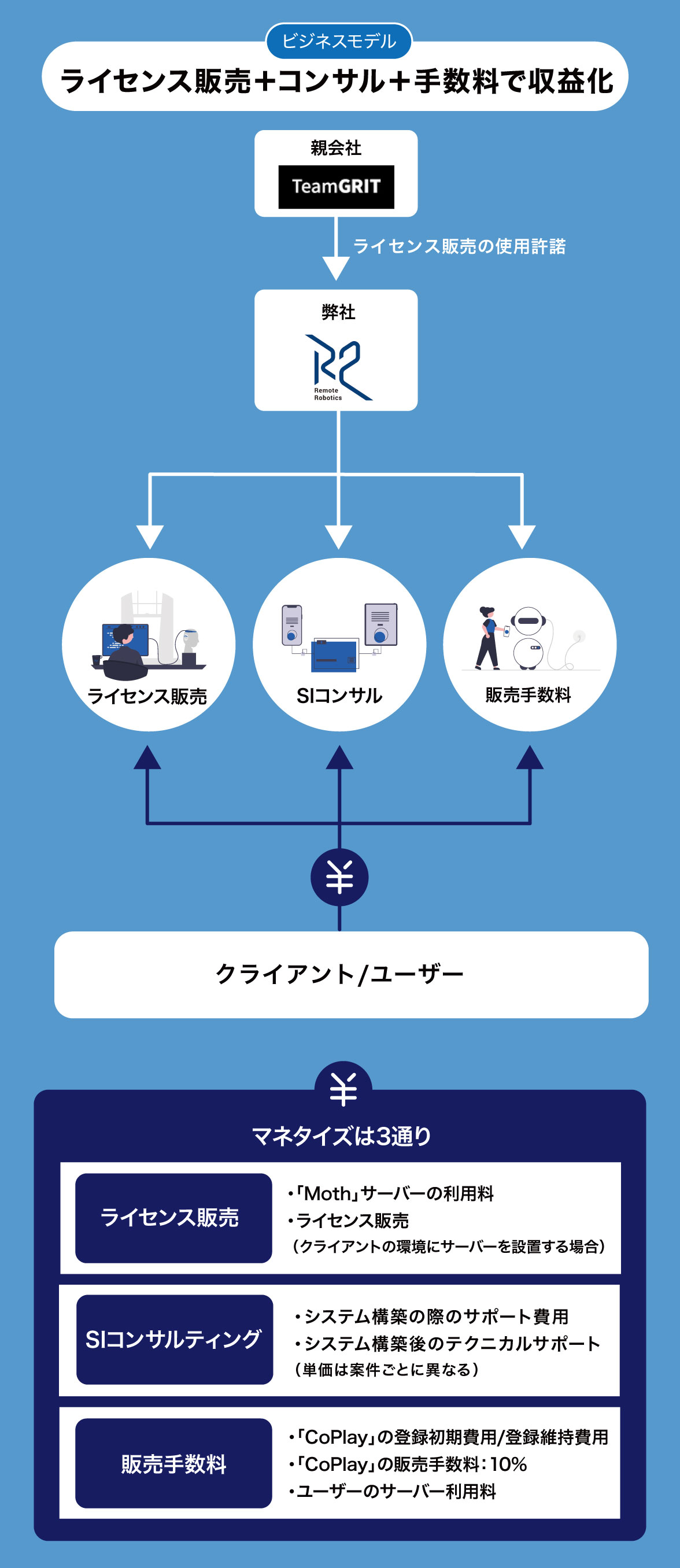 「CoPlay」に登録された商品は弊社のサーバーを利用して操作するため、販売手数料として約10%徴収します。また、遠隔操作するユーザーからもサーバー利用料を徴収する予定です。