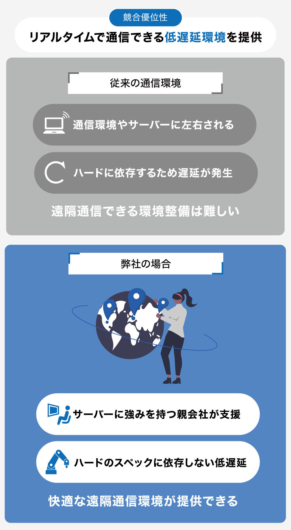 既存技術は通信環境やハードウェアのスペックに左右されることから映像に遅延が発生することが多く、リアルタイムで遠隔地のロボットを操作することが難しい