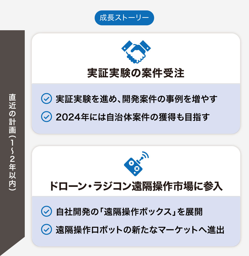 直近 足元では、複数の既存顧客と行っている実証実験の成功、本開発案件の受注拡大を図っております。結果として、2社から本システム開発を進めることでお話をいただいています。このまま継続して顧客ニーズに合わせた実証実験の提案、本案件の提案活動を続け、さらに成長させていく計画です。