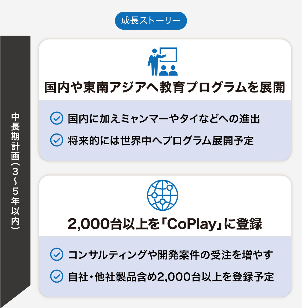 「CoPlay」での自社ロボット販売拡大を計画しています。遠隔操作ロボット教育プログラムの東南アジアへの展開も計画。実証実験やコンサルティングを行っている案件を受注し、事業拡大を目指します。