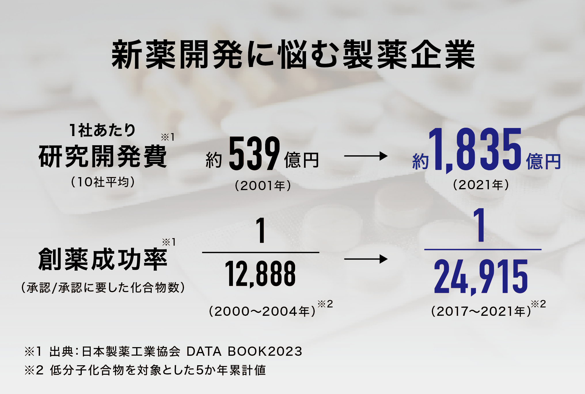 また、医薬品の開発コストが高騰し、創薬の難易度も上がっている現状があります。