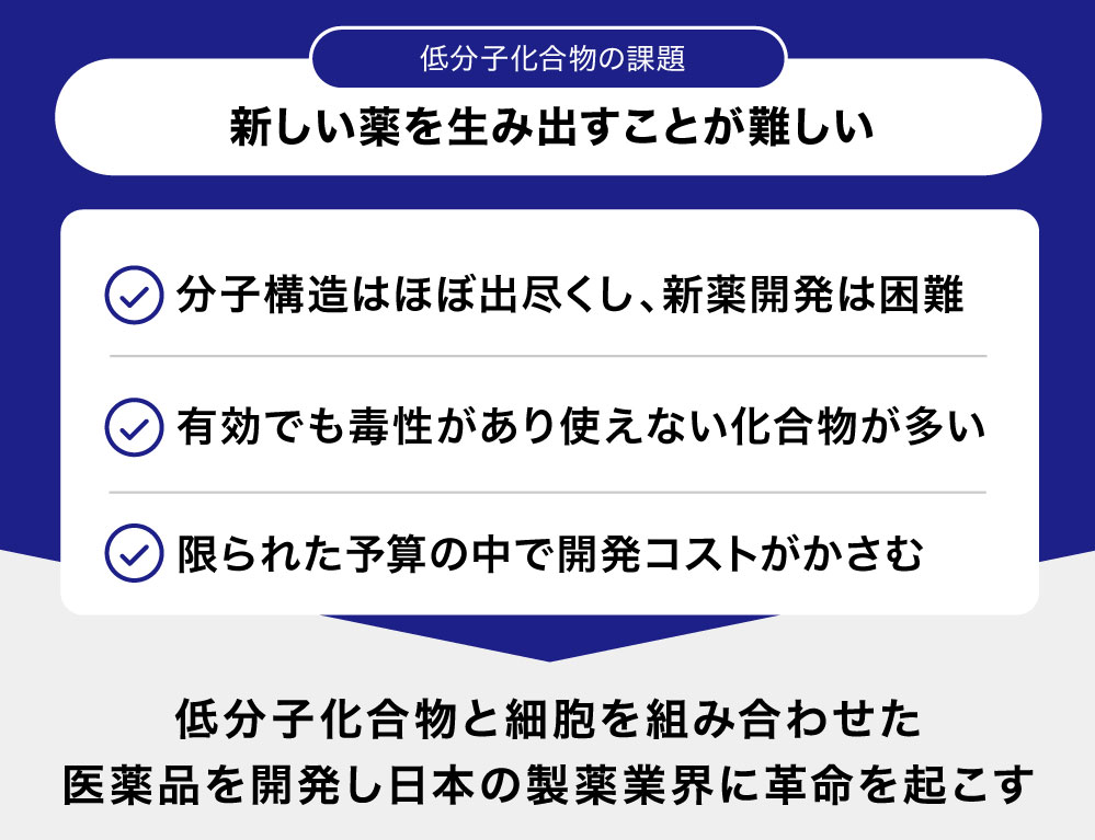 こうした低分子化合物に対する問題点を、細胞と組み合わせることで解決できるようになれば、日本の製薬業界に革命を起こせると考えています。