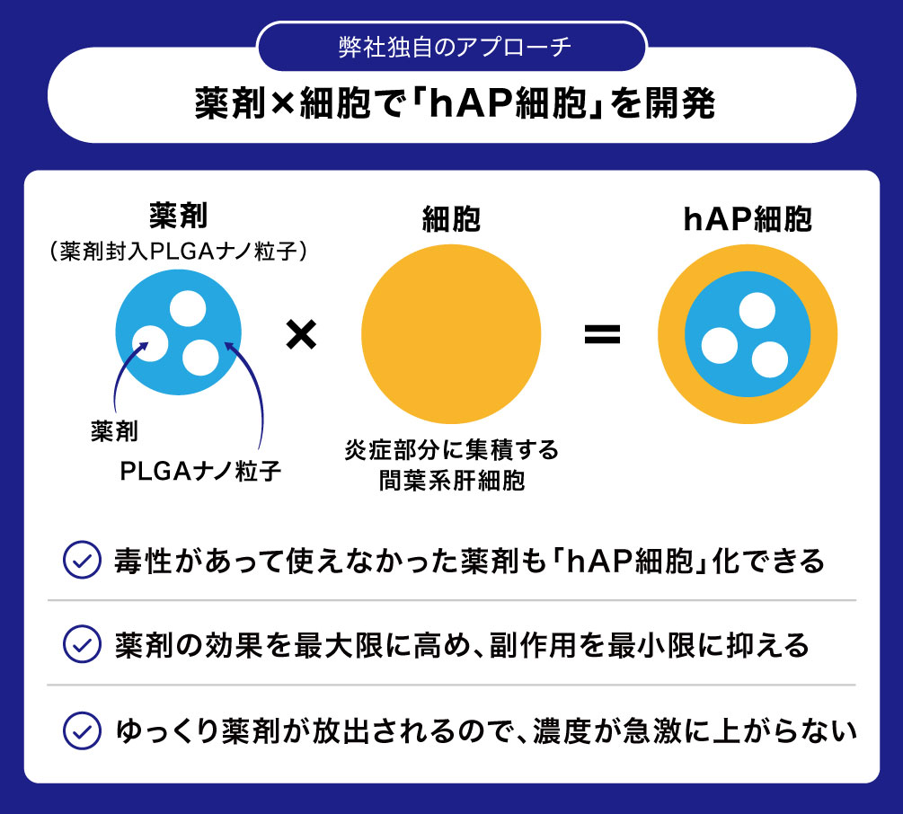 「hAP細胞」は、化合物を封入したPLGAナノ粒子(縫合糸などに使用される安全性に確認されたポリマー粒子)を細胞(炎症部に集積する性質のあるもの)に取り込ませて調製されます。