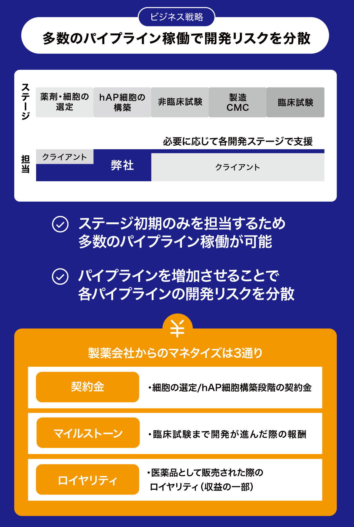 弊社は、「hAP細胞」構築を創薬プラットフォームとして国内外の製薬会社へ提供し、開発ステージに応じた収益化を計画しています。