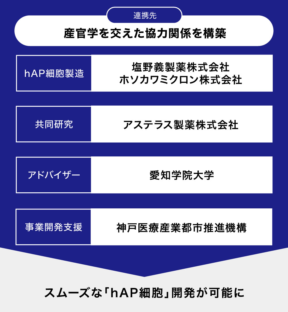 「hAP細胞」の製造開発に関して、愛知学院大学やホソカワミクロン株式会社などと協力した体制を構築しています。また、個別の「hAP細胞」の開発として、アステラス製薬株式会社との共同研究開発を進めています。