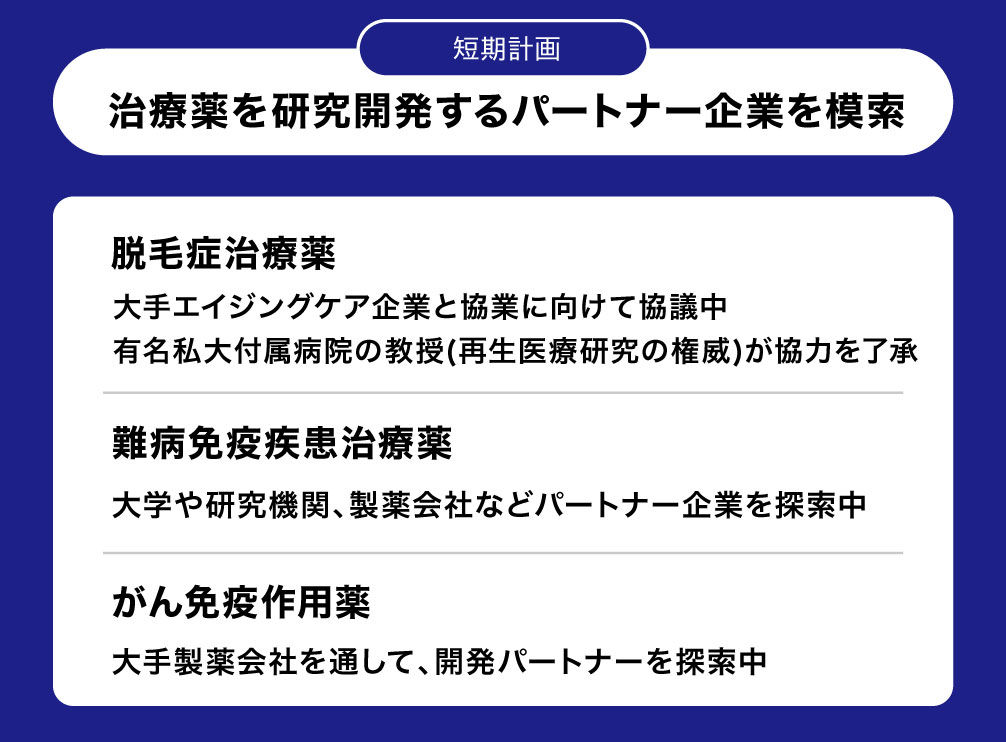 アステラス製薬株式会社との共同研究はステージ2に前進※2。今後も国内製薬会社、学術機関などとの協業でがんやAGA治療へ貢献
