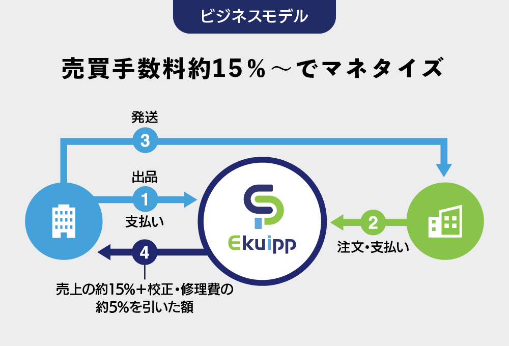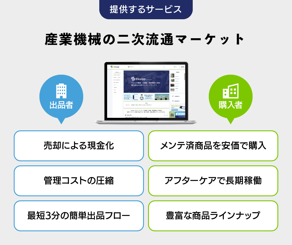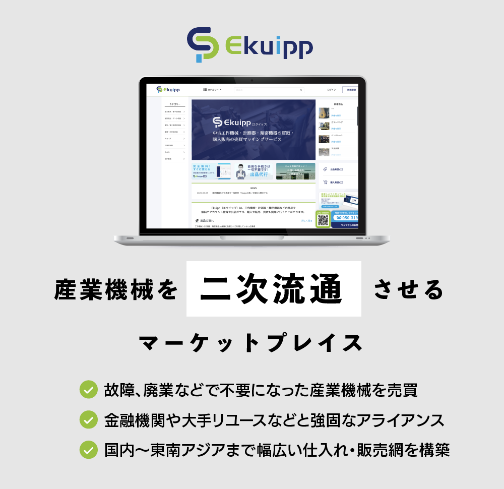 弊社は、中古産業機械に特化したオンラインマーケットプレイス「Ekuipp(エクイップ)」を運営しています。機械の売却を検討しているユーザーは、掲載料・登録料なしで出品でき、買い手とマッチングすることができます。