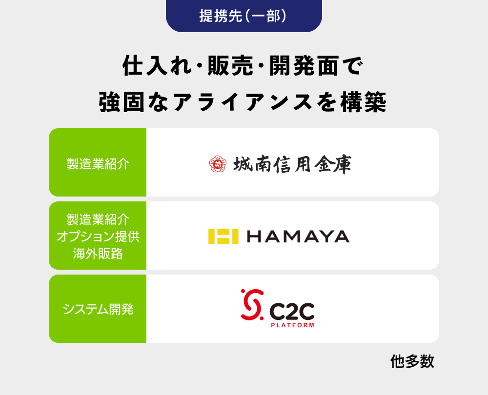 製造業者やバイヤーとのネットワーク、海外販路を持つ上場企業や商社、金融機関等とのアライアンス戦略で仕入れ・販売を強化