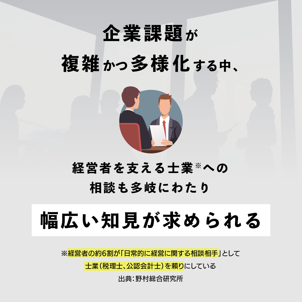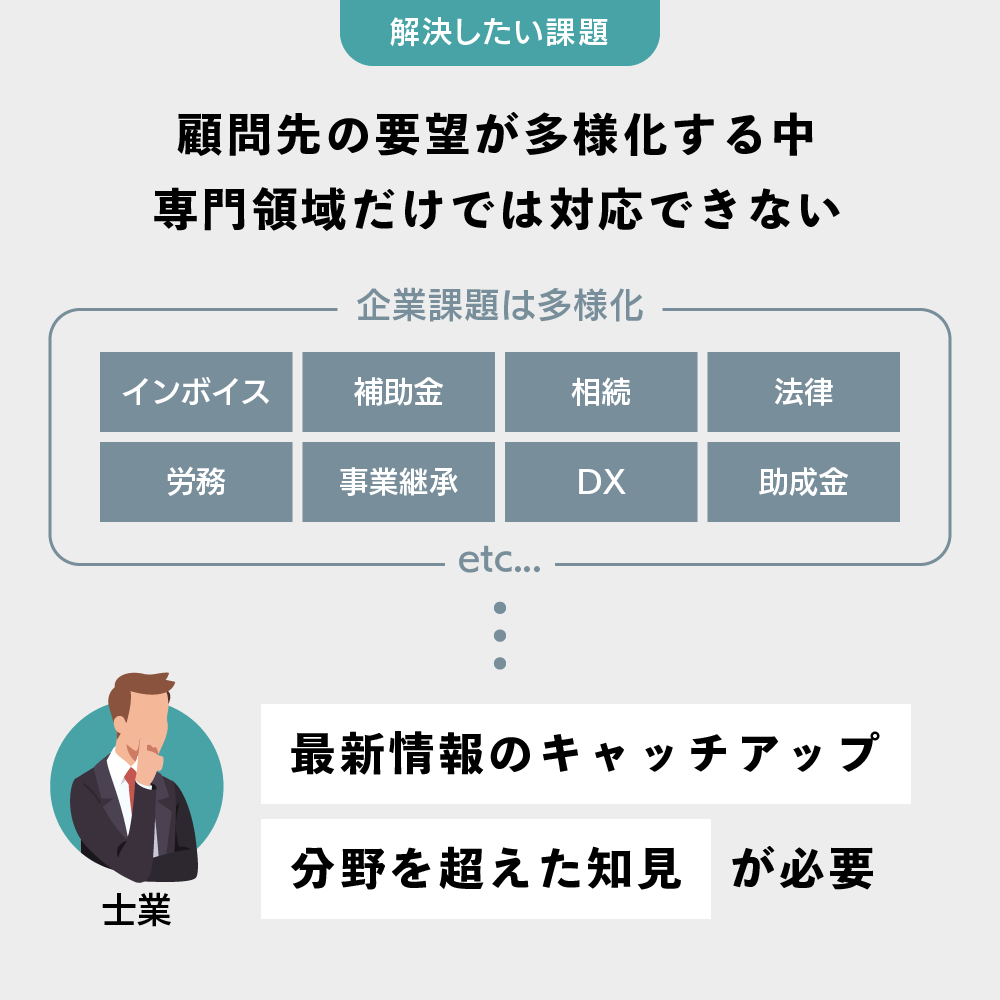 士業は、昨今の中小企業の経営課題が複雑化する中で、分野を越えた悩みを相談されるケースが増えています。そのため、自身の専門分野の知見だけでは、顧問先経営者のニーズを満たすことが難しくなってきています。