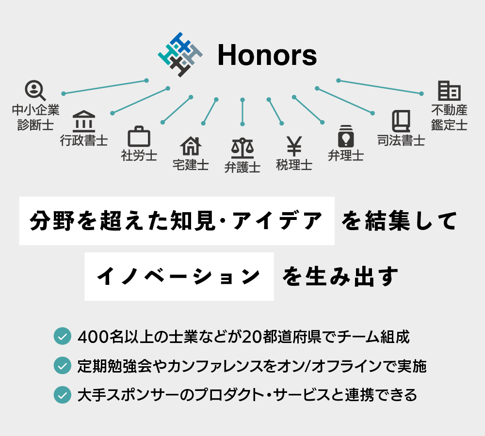 質が担保された多様な士業など400名以上が登録する、士業向けコンサルと顧客獲得マッチングプラットフォーム「Honors」を運営