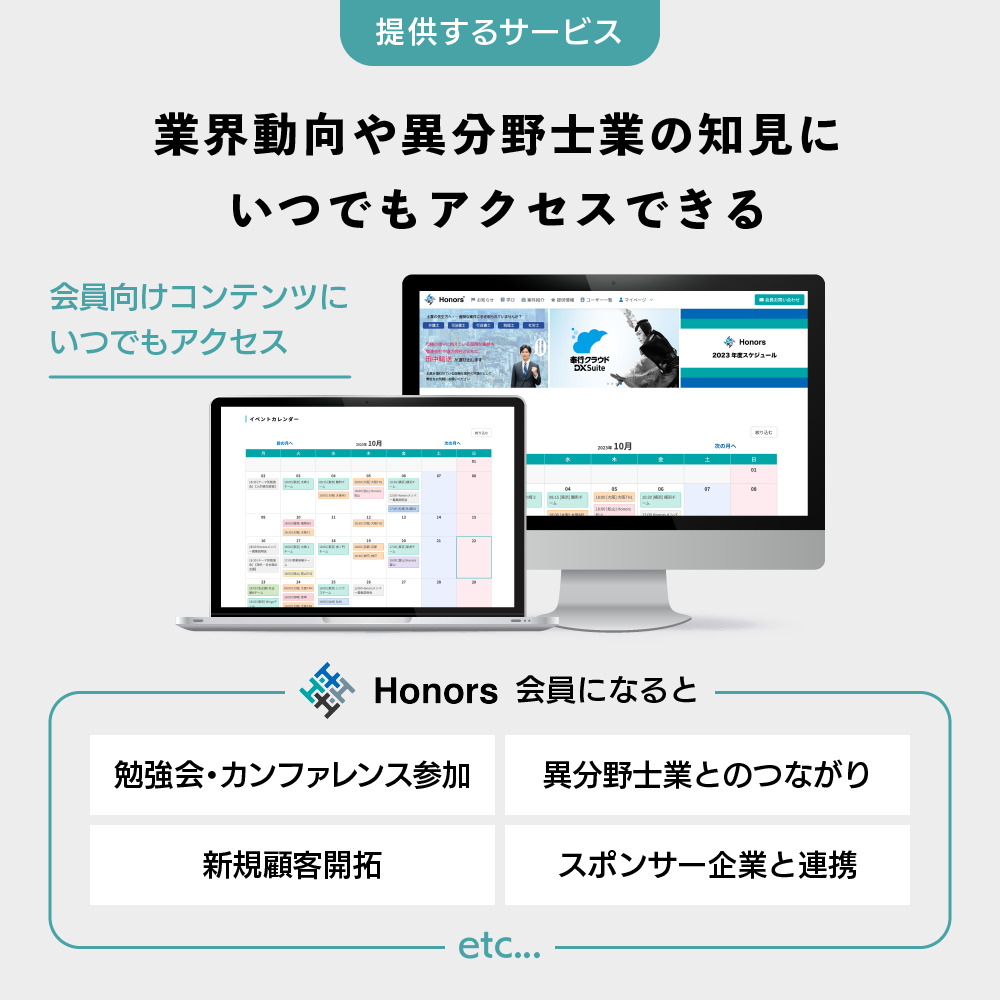 「Honors」会員になると専用サイトを通じて、月に1度の勉強会やカンファレンスをはじめとしたイベント情報や、レポート資料などにアクセスできます。専門領域の新たなアイデアを求めたり、専門外の知見を得るなど様々なニーズに応えたコンテンツを提供します。