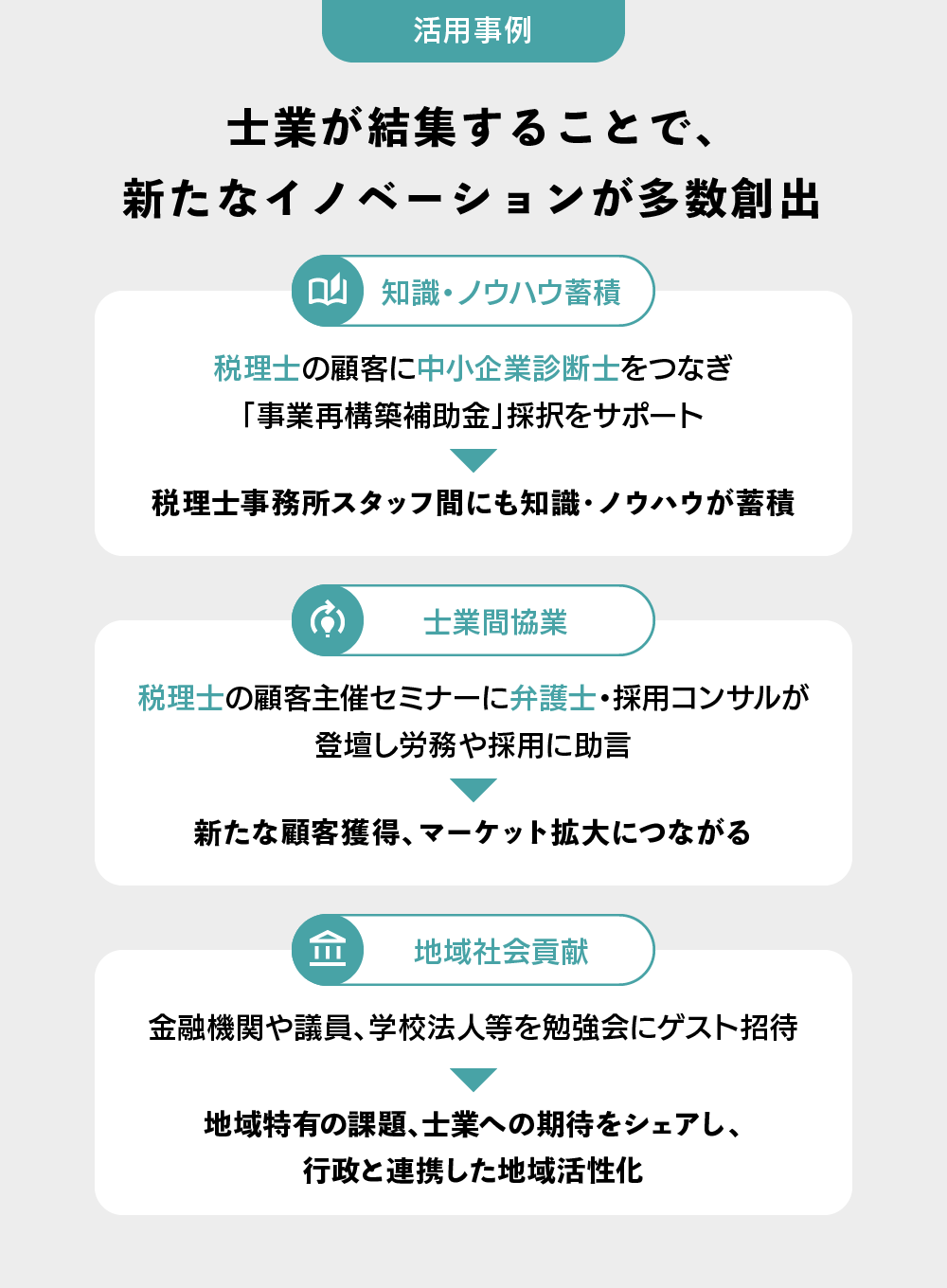 そこで重要なのが、他分野の情報収集と横の繋がりです。現状、士業の多くは独立開業して自身の事務所を経営しているため、他の士業と関わる機会がほとんどないと考えられます。