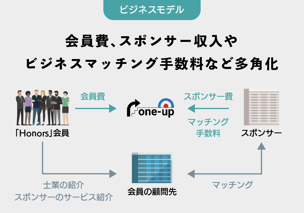 「Honors」は、①会員登録による月額売上、②士業事務所向けコンサル、③スポンサー売上でマネタイズ
