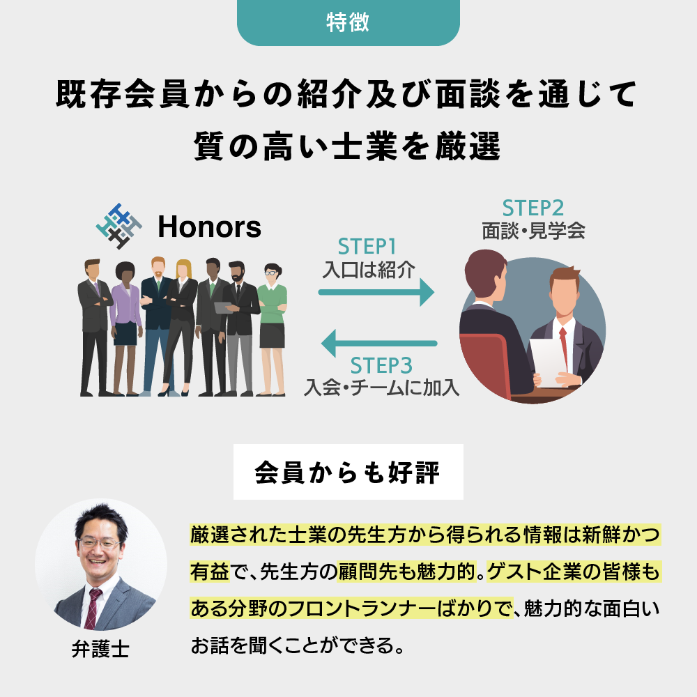 また、「Honors」を運営している弊社が士業事務所ではない点も、同業他社との違いです。士業自体が同様のコミュニティを運営している場合もありますが、自身が士業であるが故に中立性が保たれていないケースがあるのも事実です(弊社調べ)。