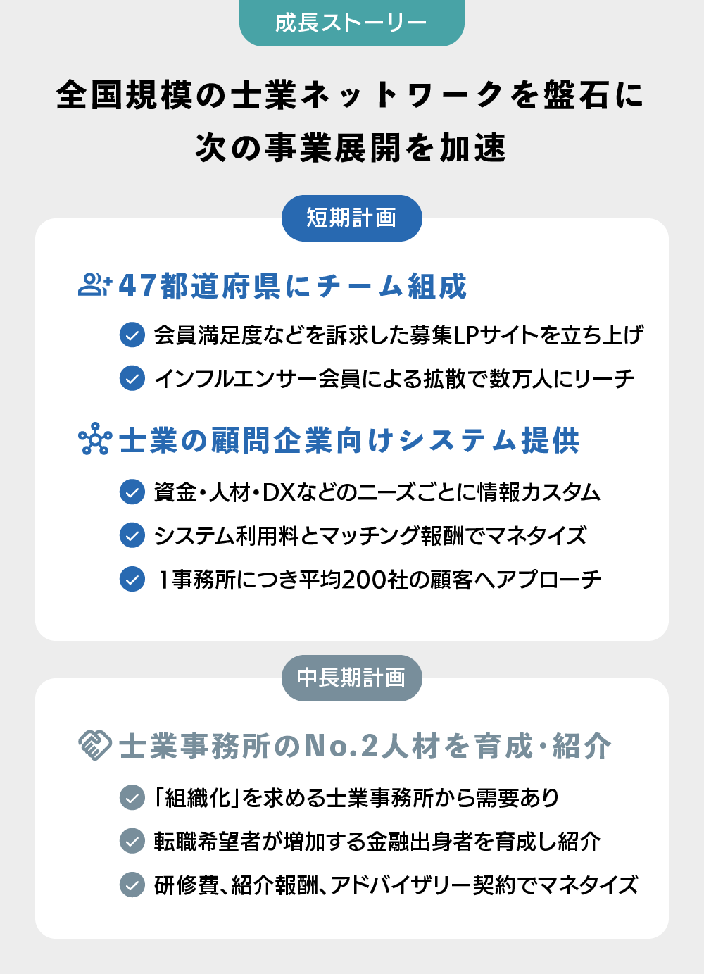 全国規模で士業を中心に、企業や自治体などとの連携を活性化させることで「Honors」の価値を上げ、メンバーの満足度を高めていきます。同時に収益源を多角化し売上を拡大する計画です。内部的には、自社の強み・可能性を数値化し、「Honors」のサービスを最大化出来る企業との連携も深めていく計画です。