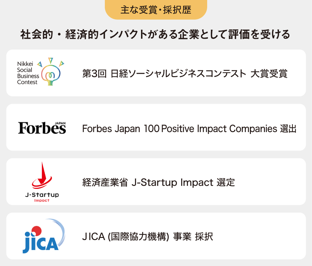 ãŸããåŒç€Ÿã®åãçµã¿ã¯ããŸããŸãªå Žé¢ã§è©äŸ¡ãããã第3忥çµãœãŒã·ã£ã«ããžãã¹ã³ã³ãã¹ããã§å€§è³ãããã ãããForbes Japan 100 Positive Impact Companiesãã«ãéžåºãããŸããã