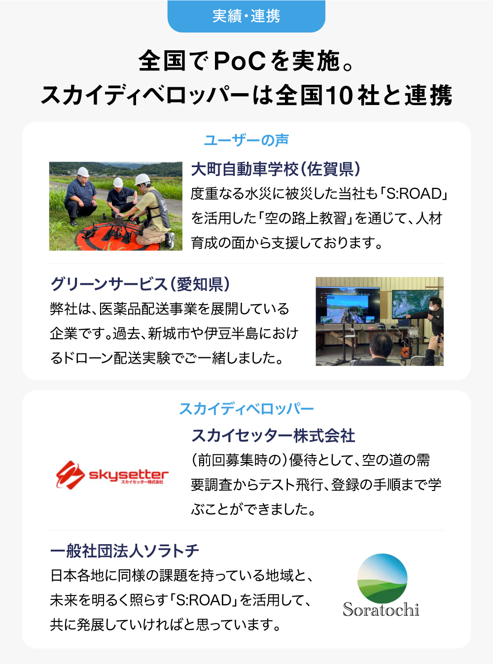 弊社は、さまざまな自治体や企業とのPoCを通して、空の道を100本以上まで拡大しています。具体的には、佐賀県多久市様や福岡県うきは市様、NEXCO西日本様、JR九州商事様等、事業者は30社以上、自治体とは20区画以上との連携実績があります(2023年11月時点)。