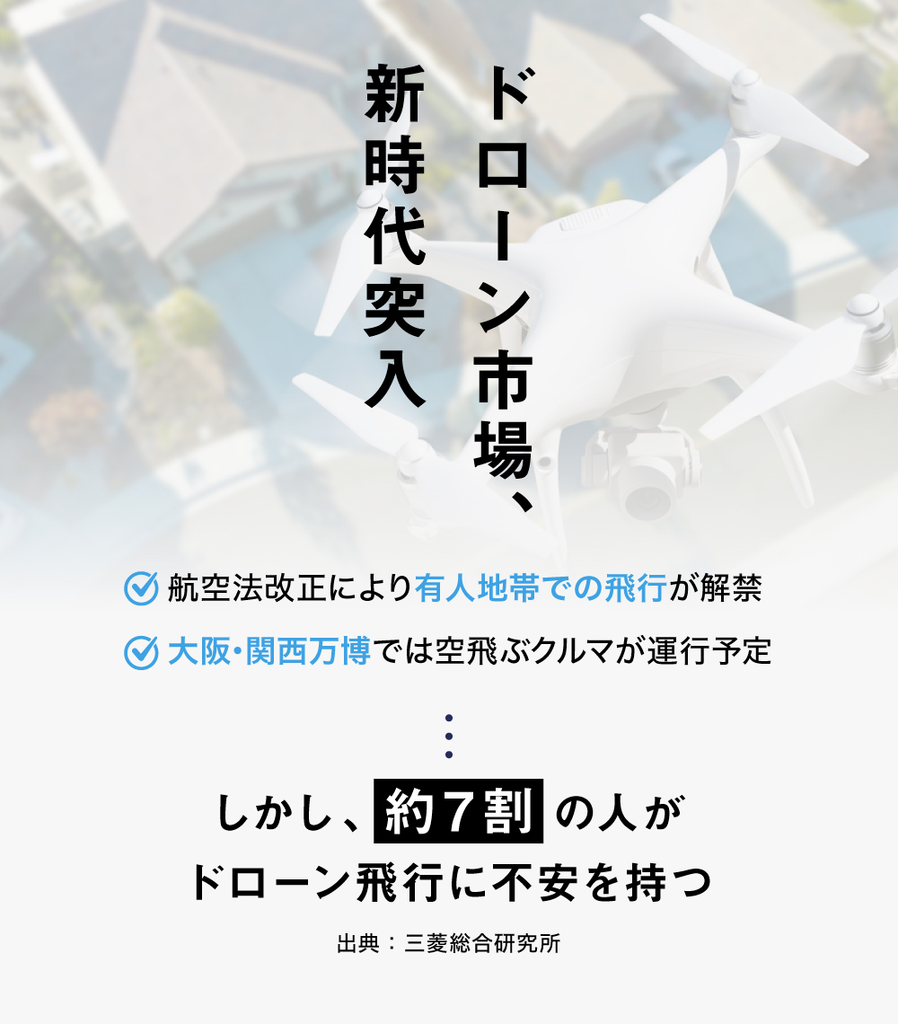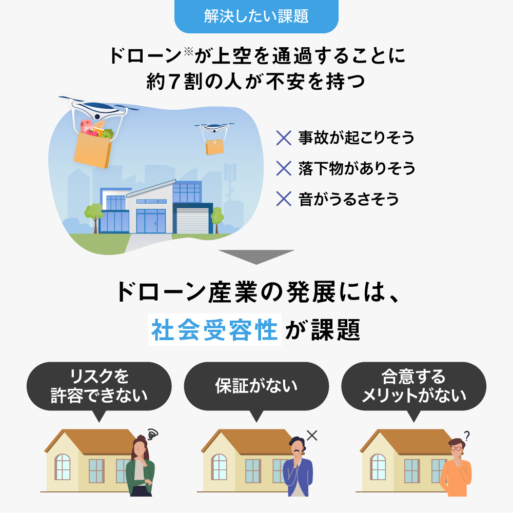 ドローンが普及するためには、空路やその下で生活する人々の安全性を確保し、社会に受け入れられる「社会受容性」を高める必要があると弊社は考えています。