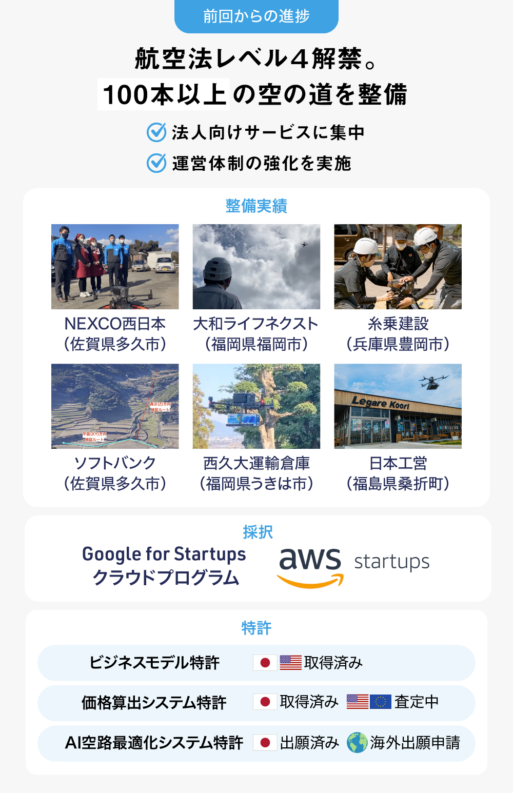 前回募集時点では10本だった空路の数を、多くの自治体や企業とのPoC(実現可能性を見極めるための概念実証)を通して、100本以上まで拡大させました(2023年11月時点)。
