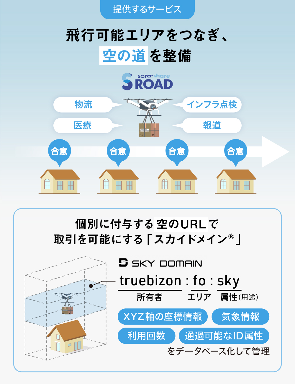 「S:ROAD」のコア技術である「スカイドメイン®︎」は、任意の空路に個別のアドレスを付与し、ドローンを遠隔で自動制御するためのデータを提供します。「スカイドメイン®︎」を活用したビジネスモデルは日本と米国で特許を取得しています。