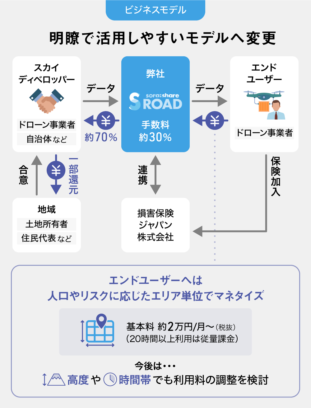 各地域のドローン事業者や自治体とは「スカイディベロッパー」として提携し、各地の住民の代表者に対して、ドローンの飛行許可について合意形成を促す役割を担っていただきます。空路のリスク管理やパトロールも「スカイディベロッパー」が行うので、ユーザーはドローンを用いた本業にフォーカスすることができます。
