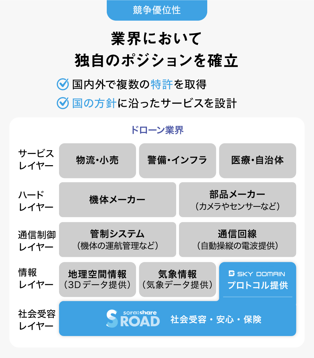 ドローン市場の確立には、様々なレイヤーが存在します。弊社は、地域社会と各種ドローン事業者を結ぶ「社会受容」レイヤーとして、独自のポジションを築いています。現在、同レイヤーには競合が少なく、業界で優位に事業展開しています。