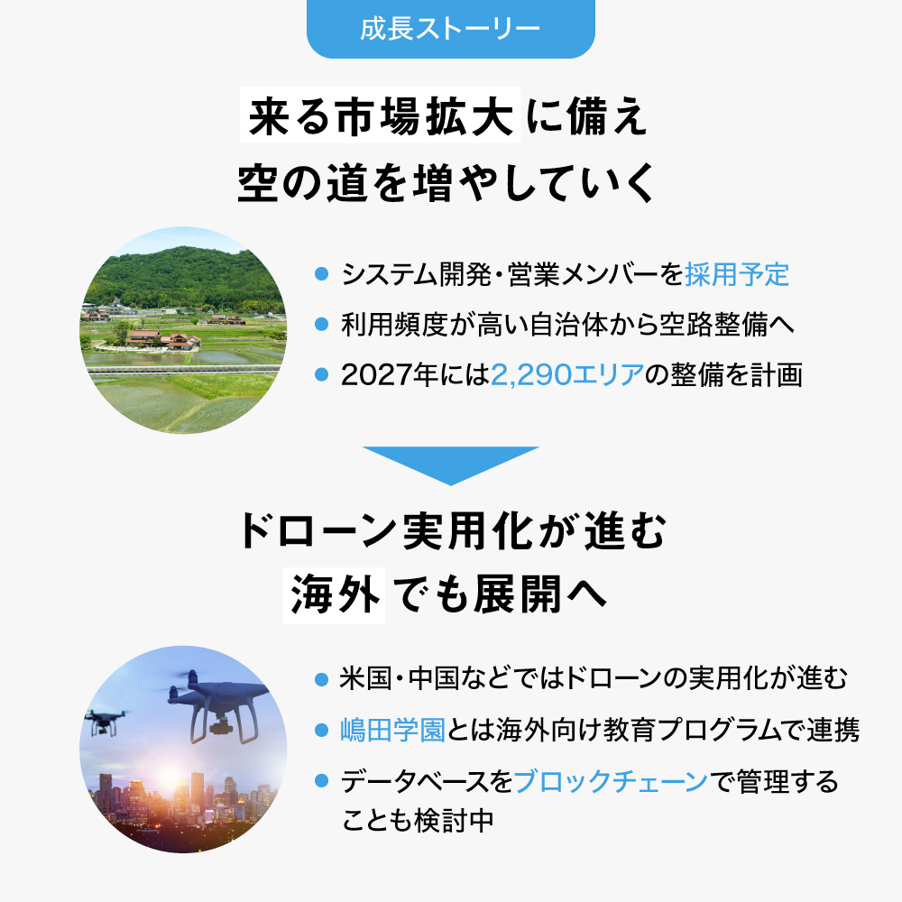 レベル4を前提とした物流や警備でのドローンビジネスの成長に伴い、様々な業界でドローンの空路調整事業の需要が伸びると予測されます。自治体連携を加速すると同時に、株式上場準備の本格対応含め、更なる体制強化を進めます。