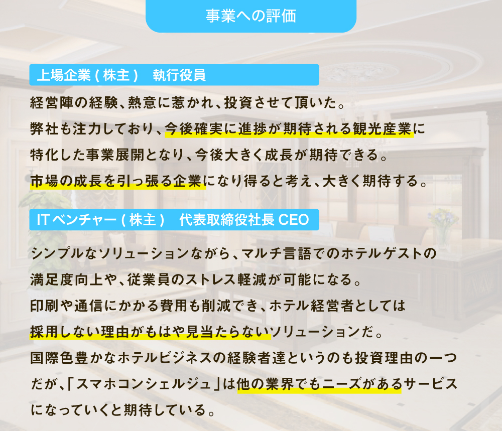 このサービスを作り上げたメンバーは国際色豊かなホテルビジネスの経験者たちというのも投資理由の一つですが、スマホコンシェルジュを見ていると、ホテルにとどめておくにはもったいない、他の業界でもニーズが出てきそうなサービスになっていくのではないかと期待しています。