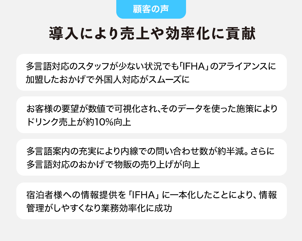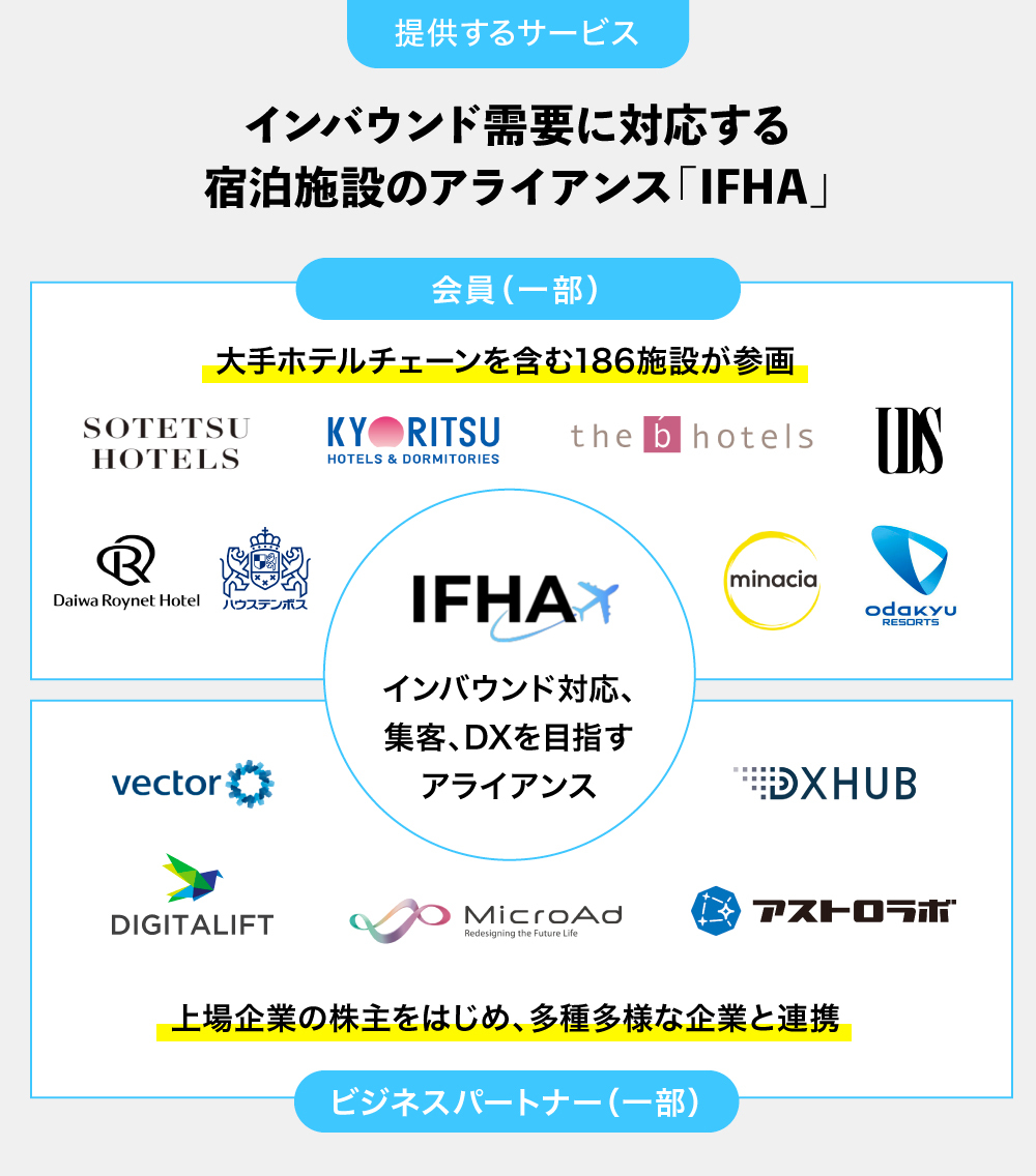 弊社は、インバウンド対応に課題を抱える国内の宿泊施設向けに、インバウンド対策に特化したアライアンス「IFHA(インバウンド・ファースト・ホテル・アライアンス)」を提供しています。
