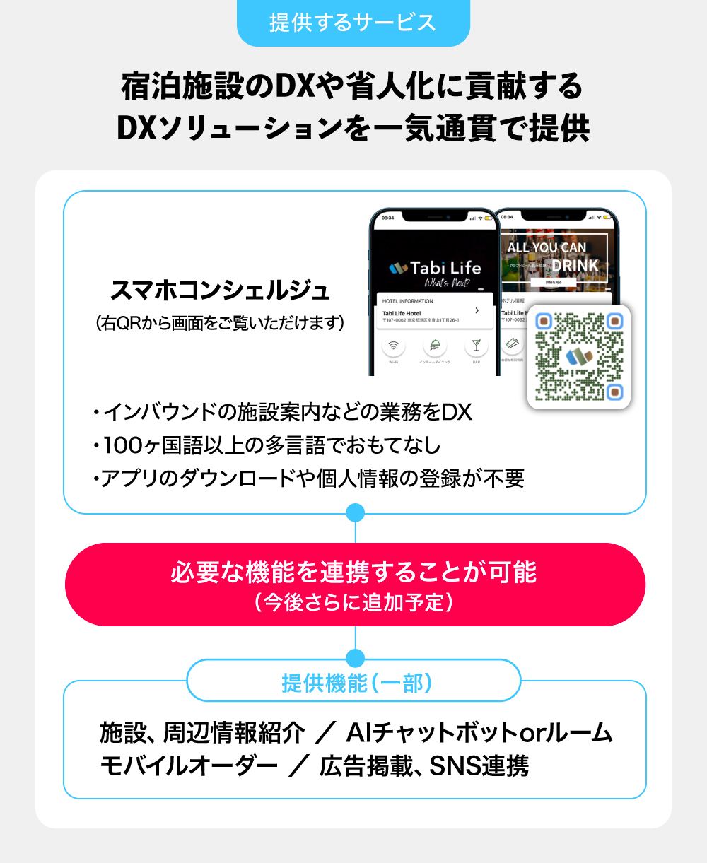 そんな、多くの宿泊施設が困っている問題点を解決できるのがTabi Life株式会社の「スマホコンシェルジュ」だと思っております。