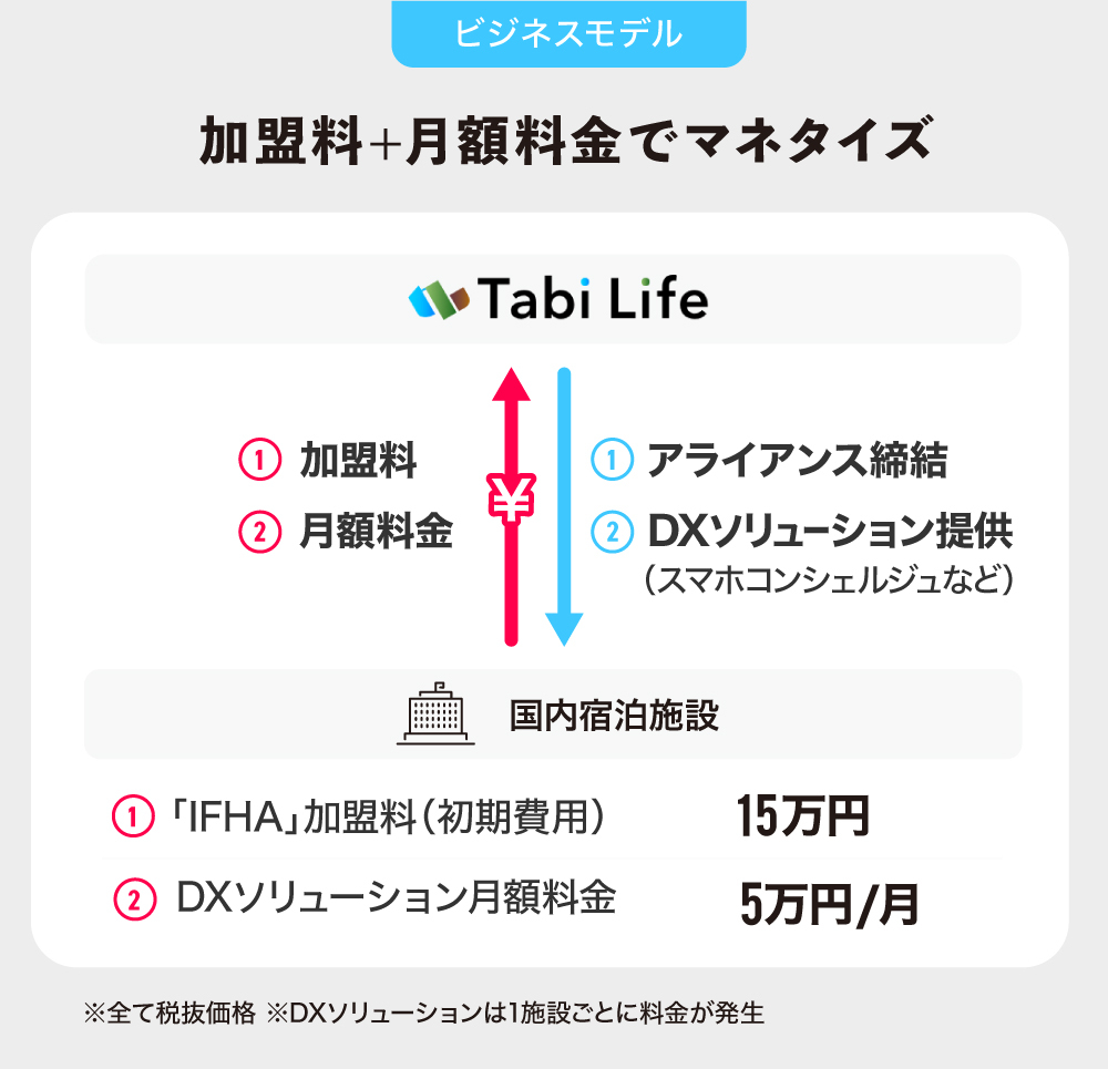 「IFHA」への加盟料(初期費用)が15万円(税抜)、DXソリューションの月額料金が1施設あたり毎月5万円(税抜)となっています。