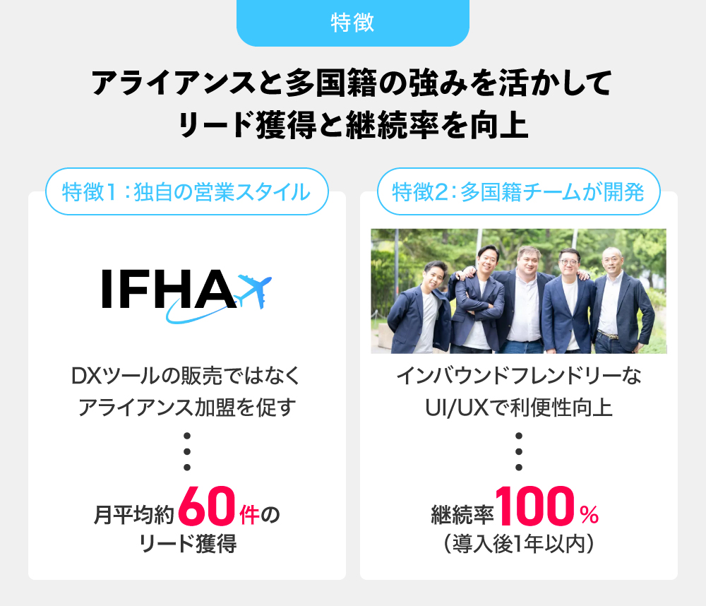 弊社は、インバウンド対策に特化したアライアンス「IFHA(インバウンド・ファースト・ホテル・アライアンス)」とDXソリューションを全国の宿泊施設に提供し、前述した課題を解決していきたいと考えています。